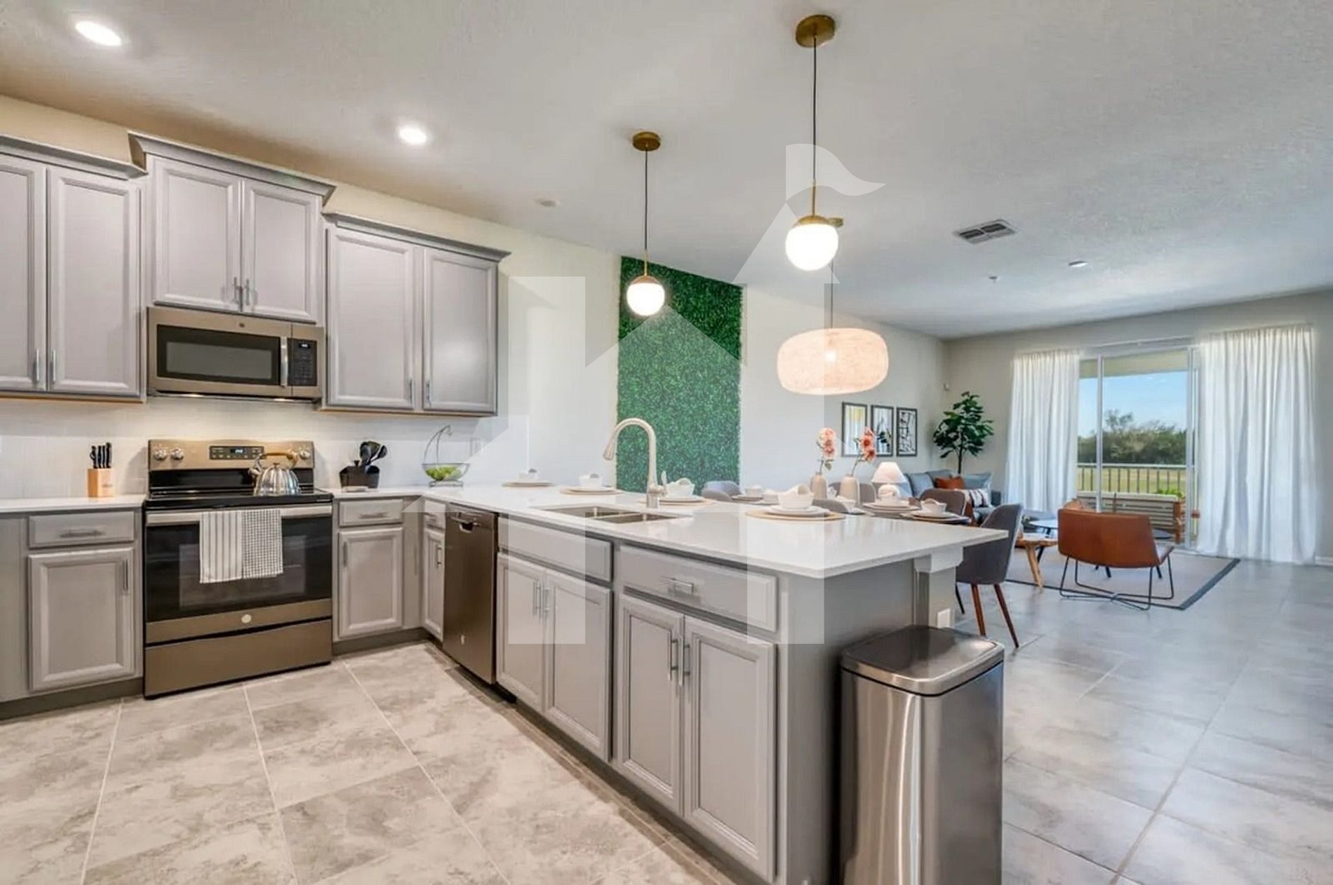 Discover our stunning 3BR/2BA condo in the heart of Champions Gate, designed to host up to 11 guests with comfort and style. The open-concept living room connects seamlessly to the fully equipped kitchen and cozy dining space, creating the perfect setting for family meals and shared moments. Relax after a day at Disney or Orlando’s attractions in a home that blends convenience, elegance, and a welcoming atmosphere for all ages.