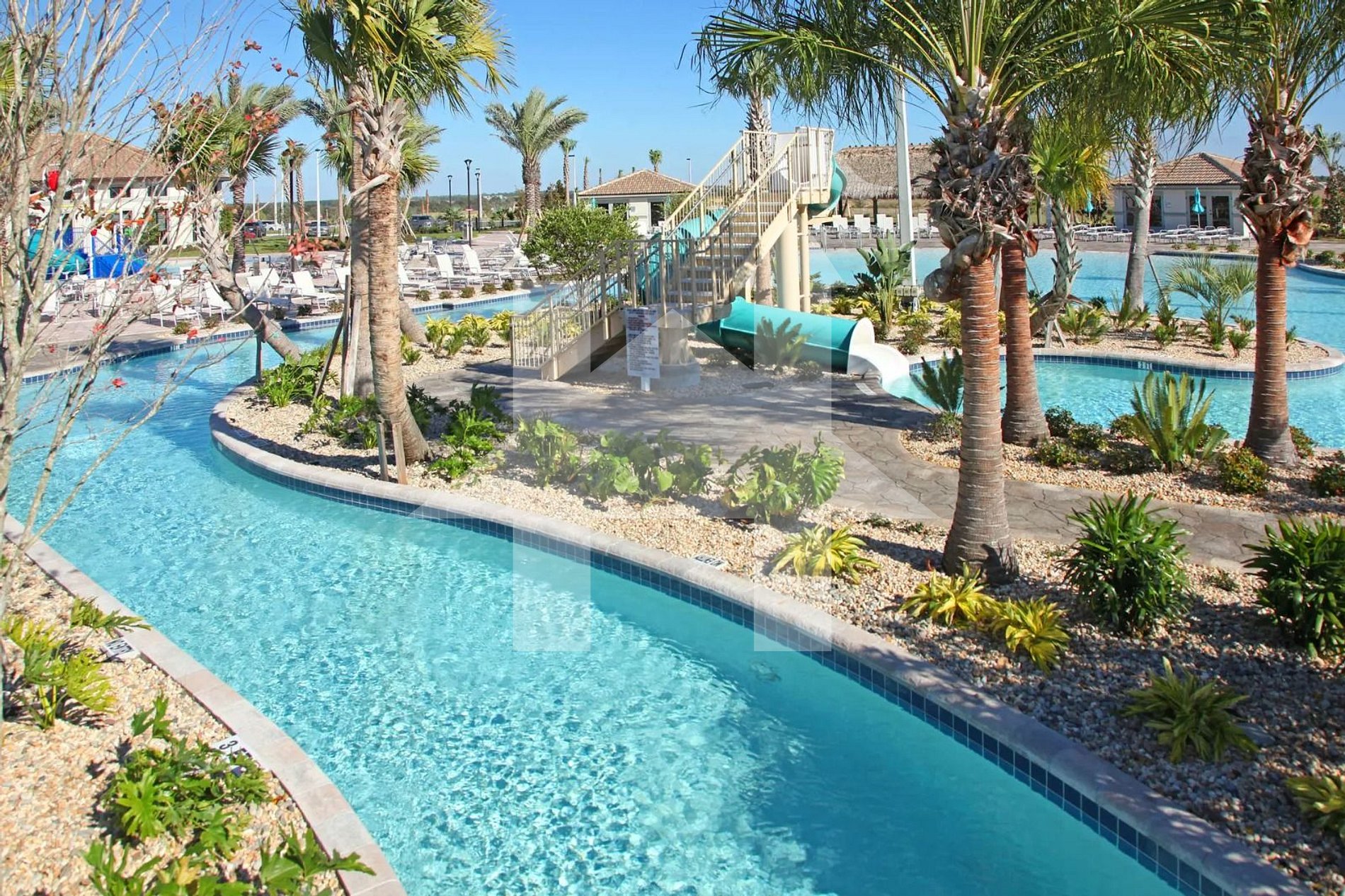 Resort-style water park with lazy river, slides, and splash zone for kids