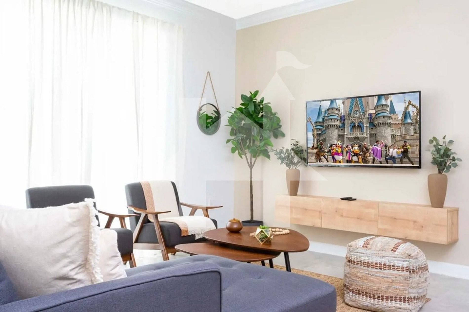 The spacious living room seamlessly connects to the dining area and fully equipped kitchen, creating the ideal setting for family gatherings. The open floor plan and modern décor offer a stylish yet cozy atmosphere.