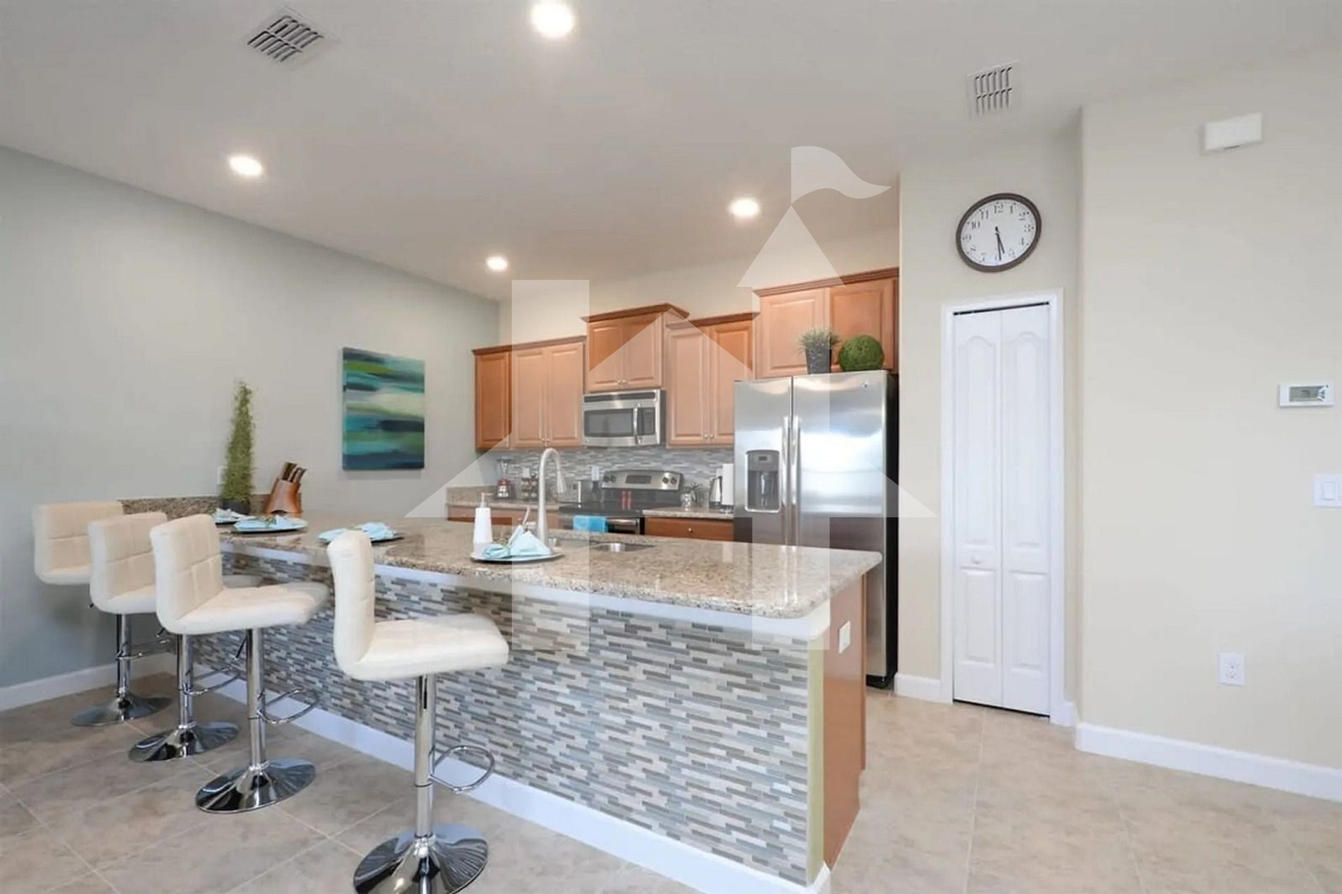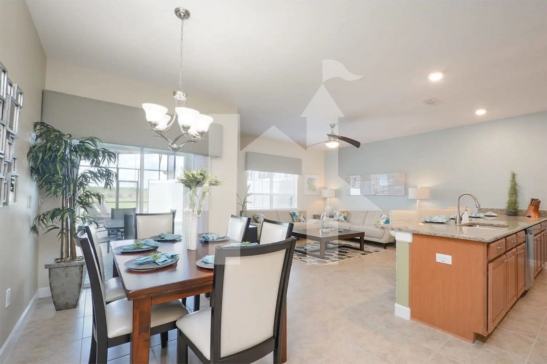 -Open-Plan Living Area: Spacious living room seamlessly connected to the dining area and a fully equipped kitchen with stainless steel appliances and granite countertops.