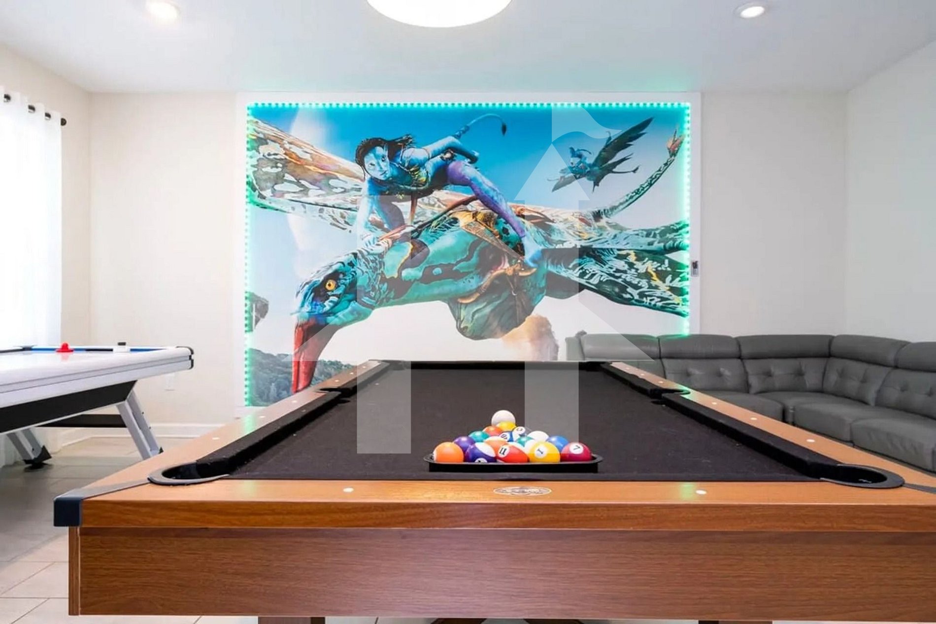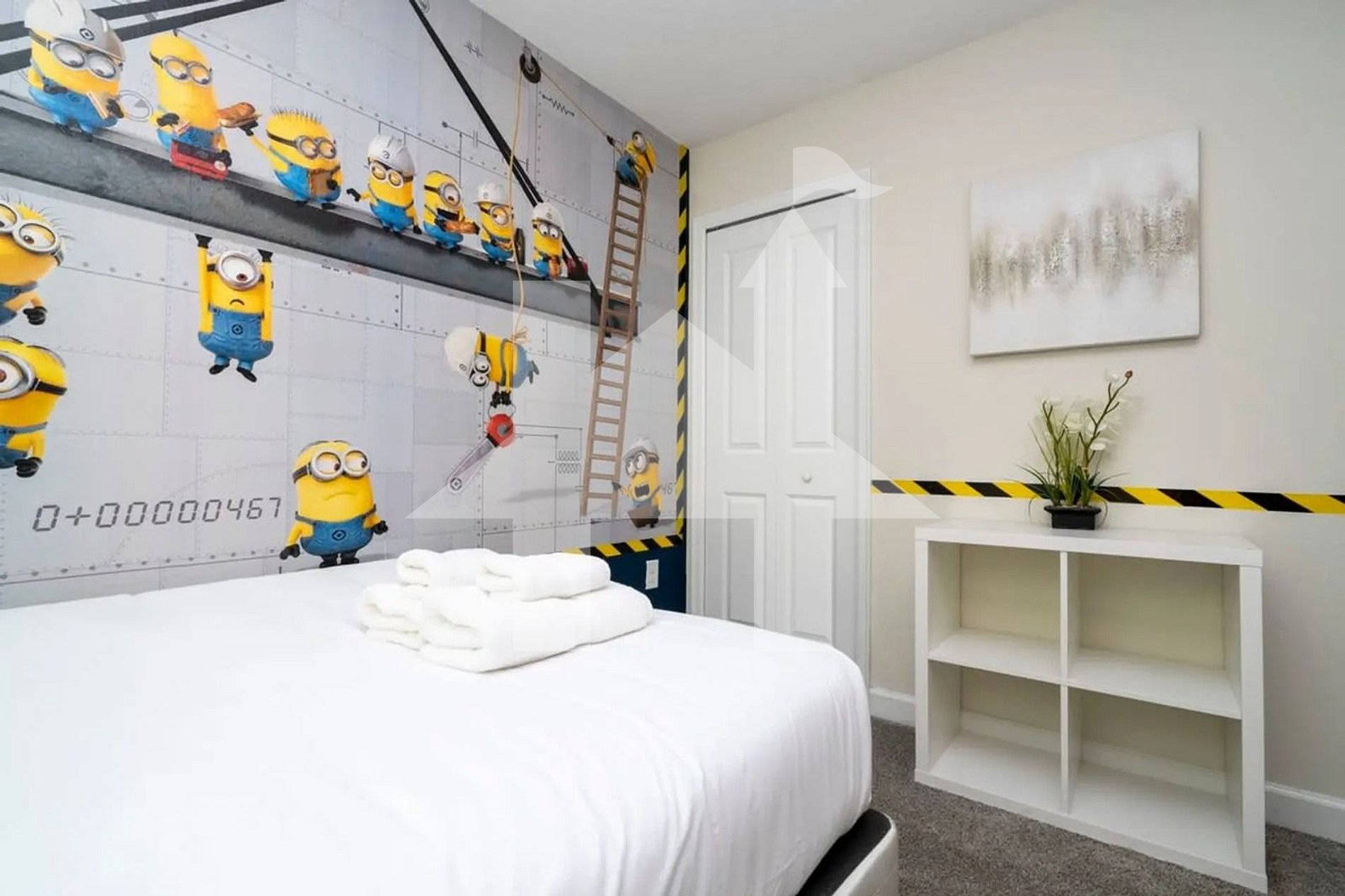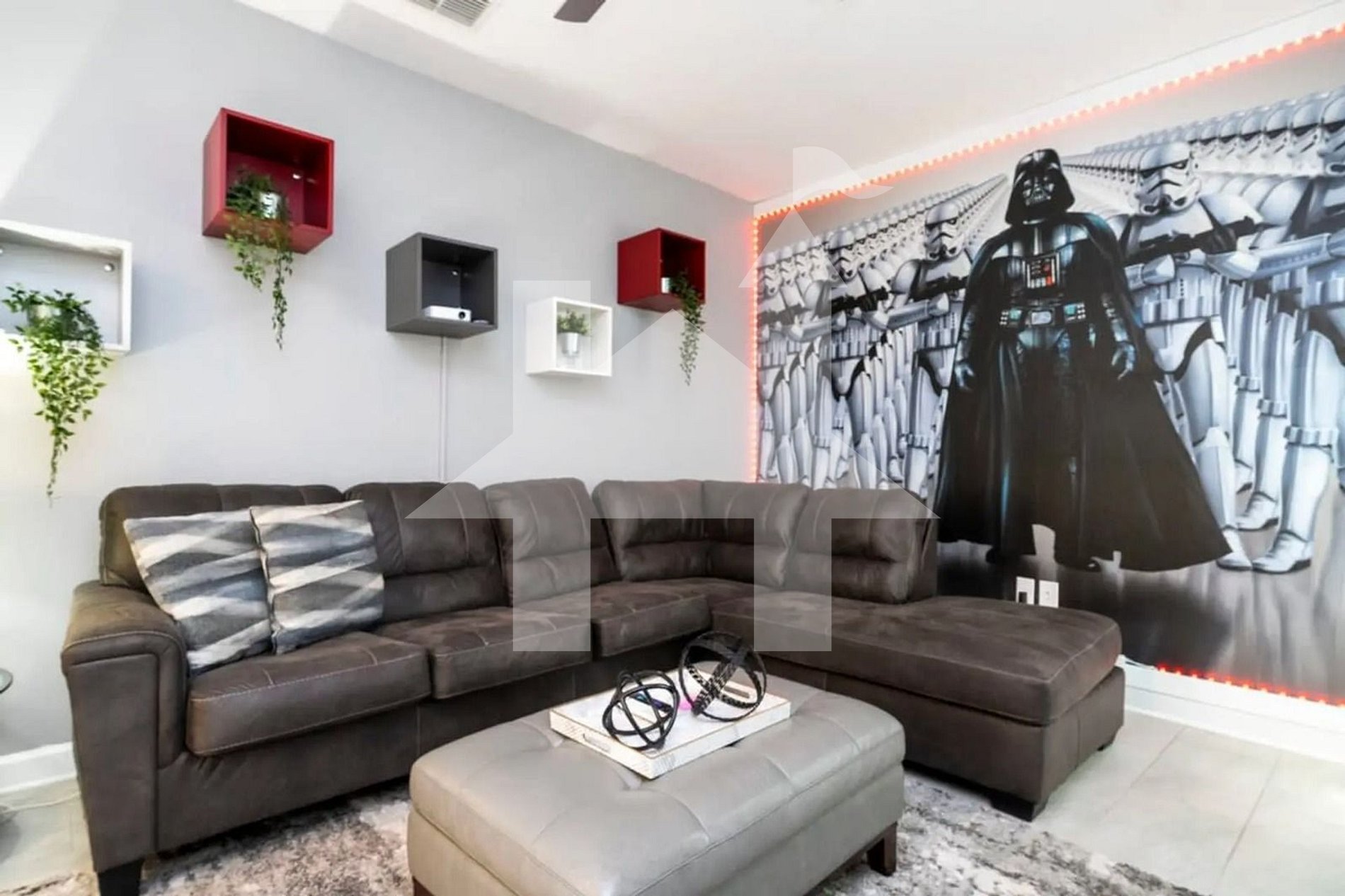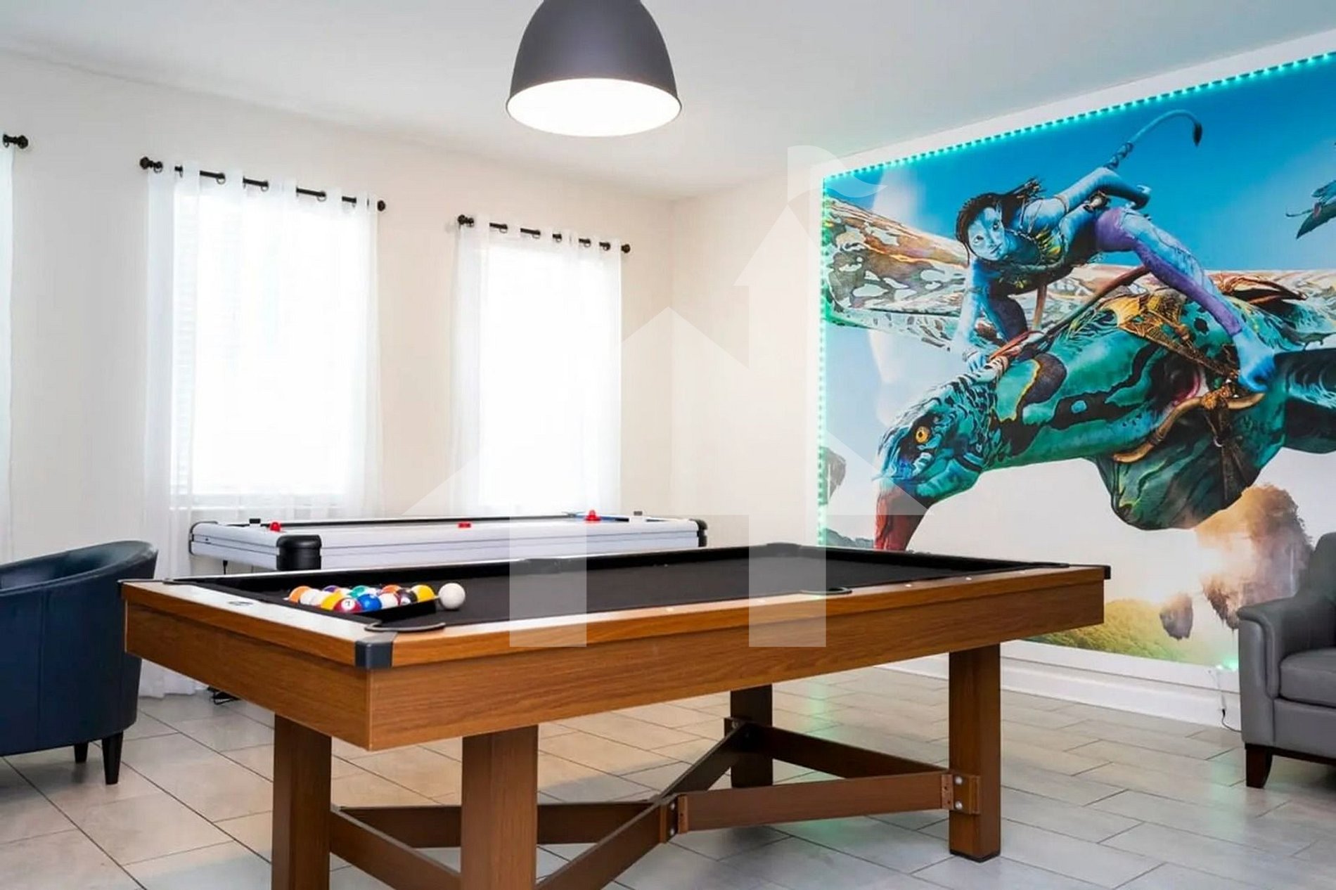 Luxury 6BR/6BA villa at Storey Lake Resort, minutes from Disney. Enjoy private heatable pool, themed entertainment rooms (Star Wars TV & Avatar game room), and bedrooms inspired by Mickey, Minions, Frozen, Moana, and a Harry Potter family loft. Sleeps 16 guests comfortably. Modern kitchen, laundry, fast Wi‑Fi, and parking included. Pool heating and BBQ grill available at extra cost. Ideal for families seeking magic and comfort!
