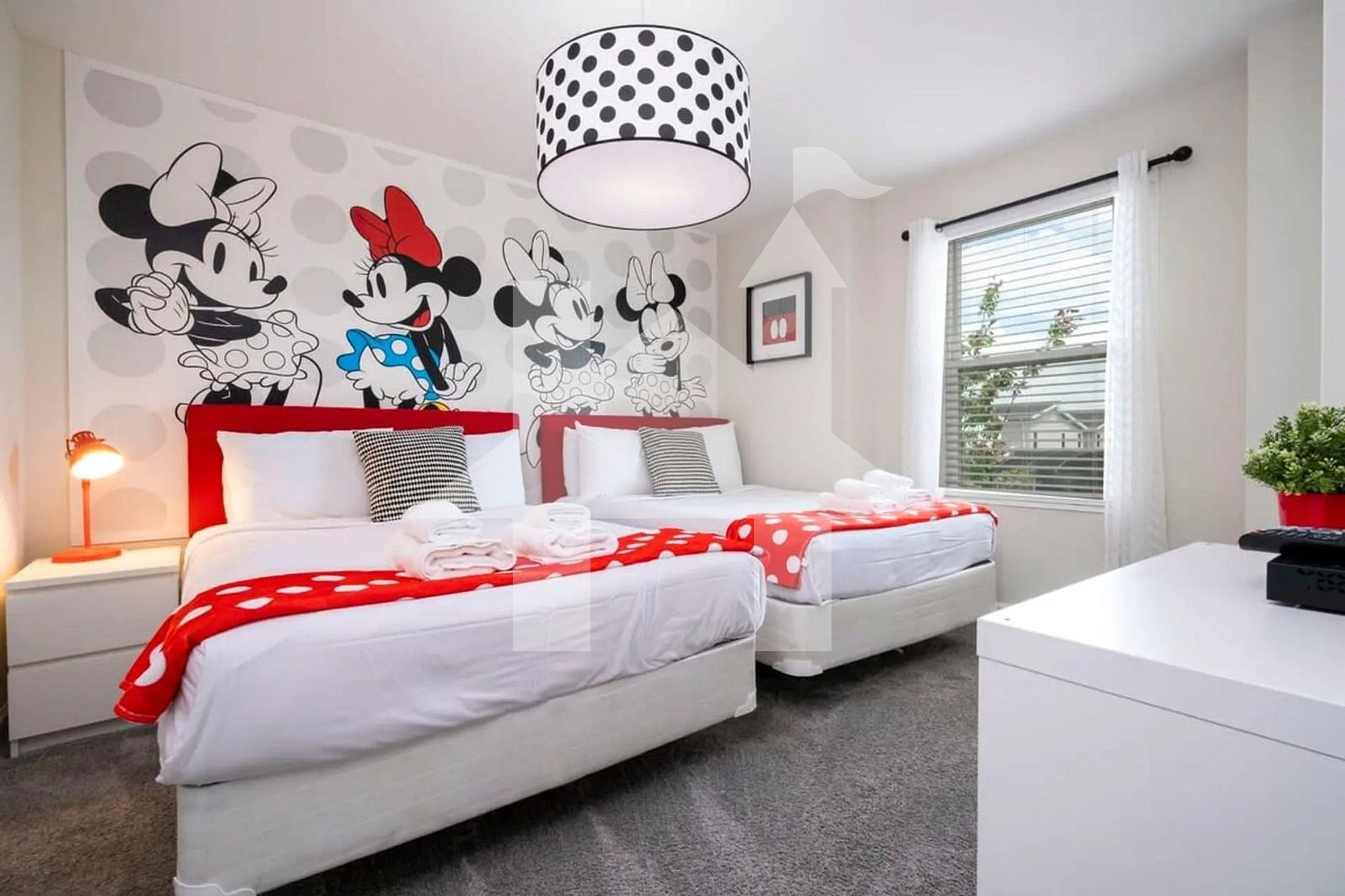 -1 Mickey-themed bedroom with two Full beds – colorful and fun for kids.