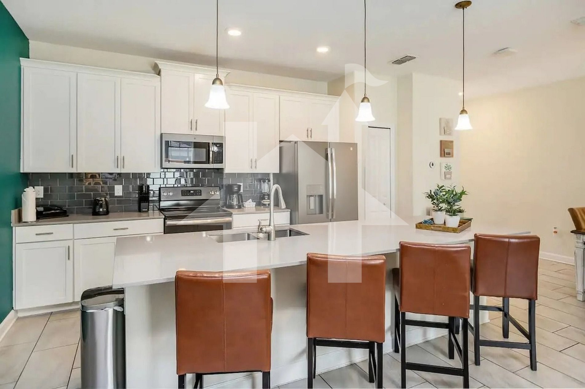 The open-concept layout connects the living room, dining area, and fully equipped kitchen, creating a welcoming space for families to gather. The kitchen features stainless steel appliances, cookware, utensils, and a coffee maker—perfect for preparing meals just like home.