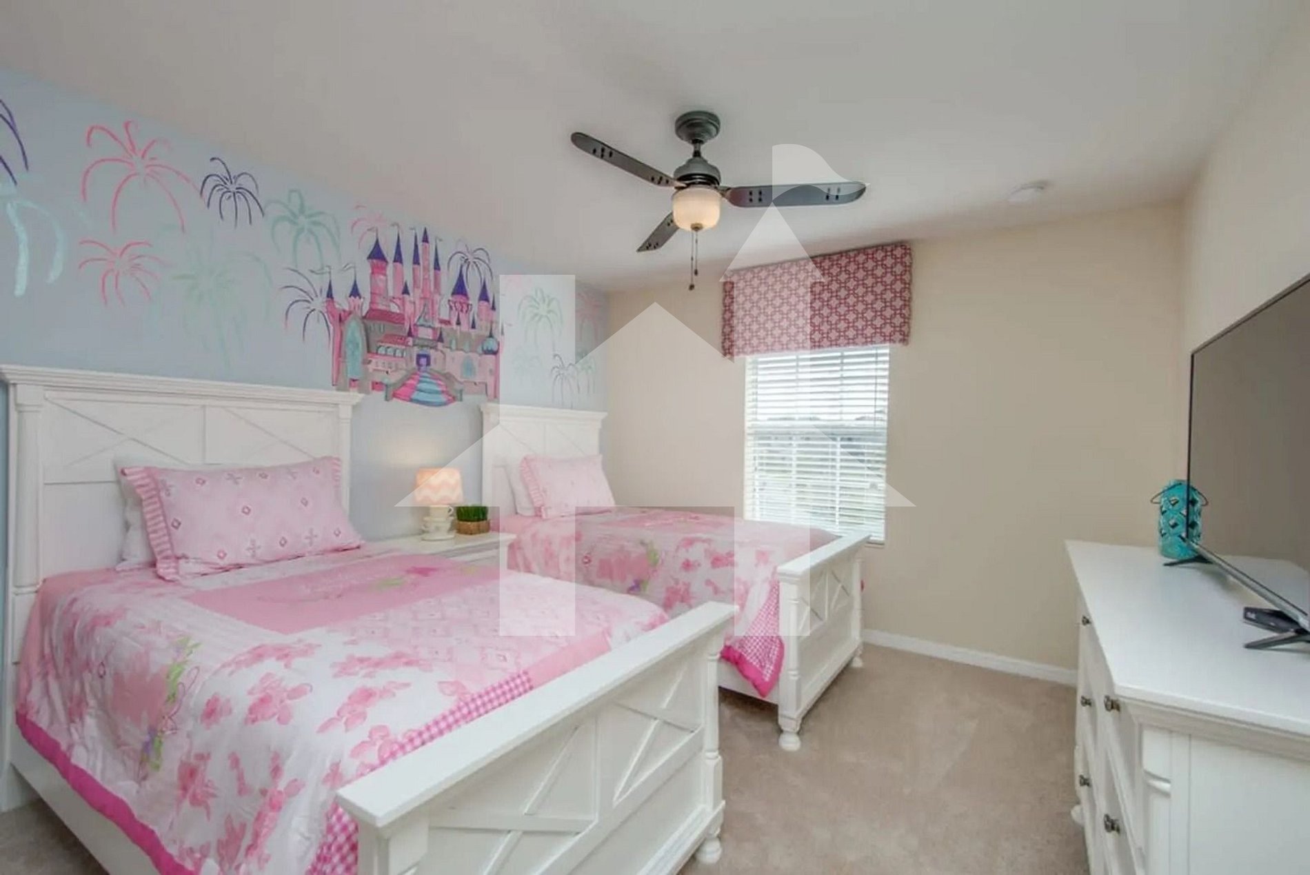 On the first floor, a king bedroom with en-suite bathroom ensures both comfort and accessibility. Upstairs, you’ll find another king master suite with private bath, along with two themed bedrooms, each furnished with two single beds and sharing a full bathroom. These rooms are designed with families in mind, providing both fun and functionality.