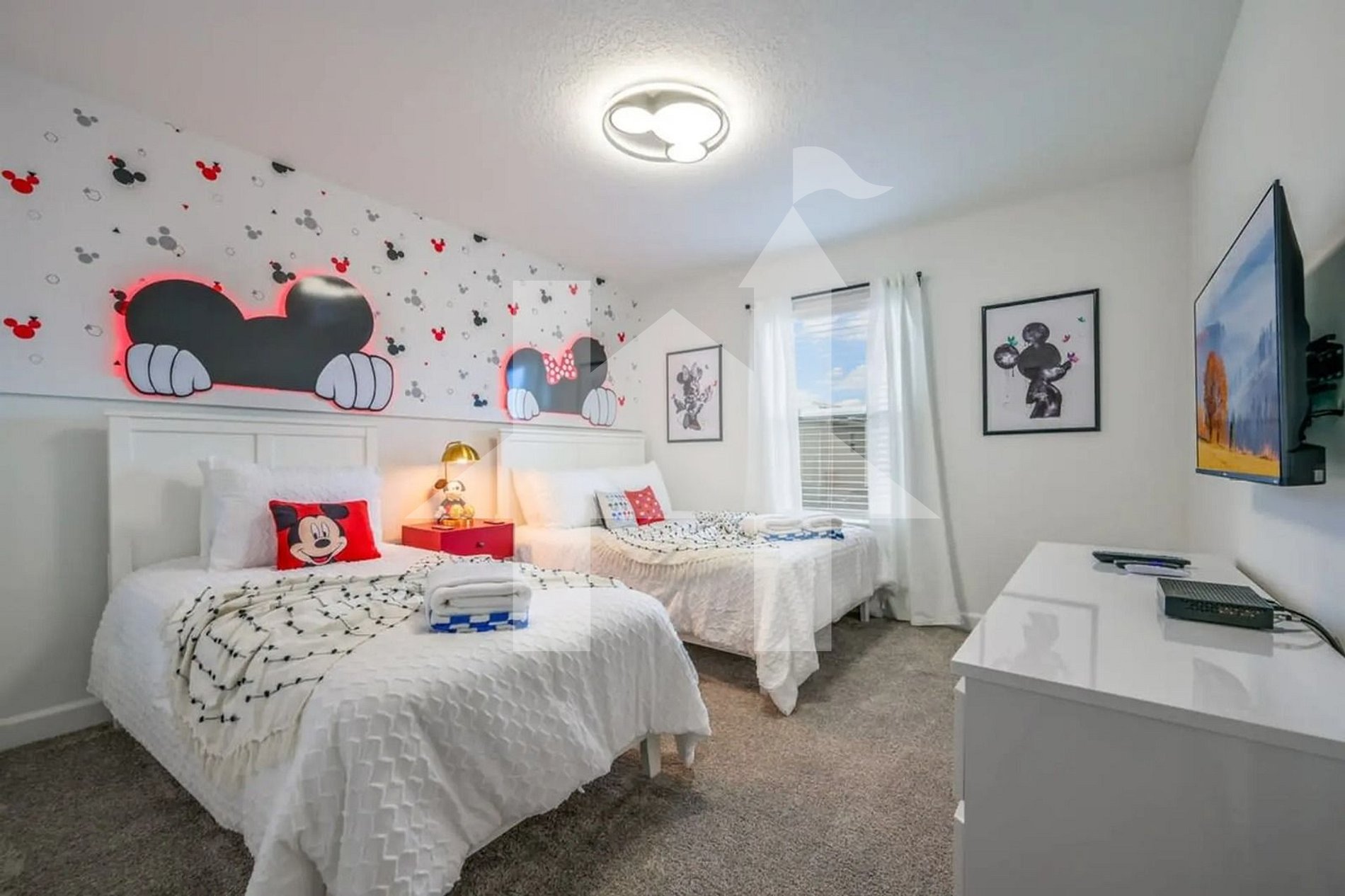 -Mickey-themed room: 1 full bed + 1 twin bed.