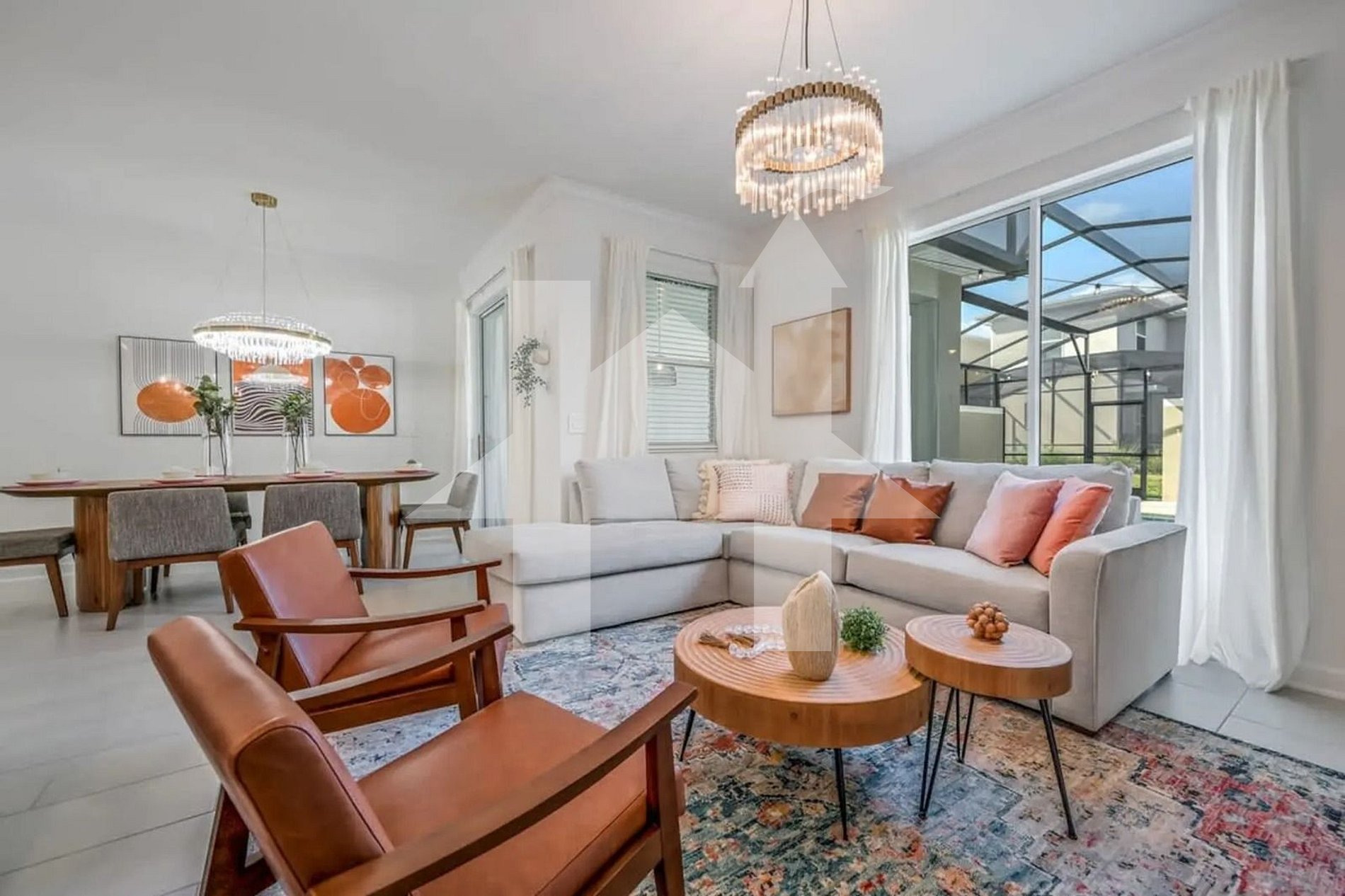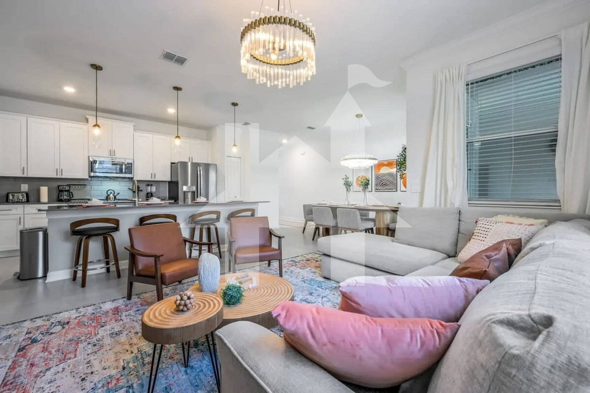 The spacious living room seamlessly connects to the fully equipped kitchen and dining area, creating a perfect environment for unforgettable moments.