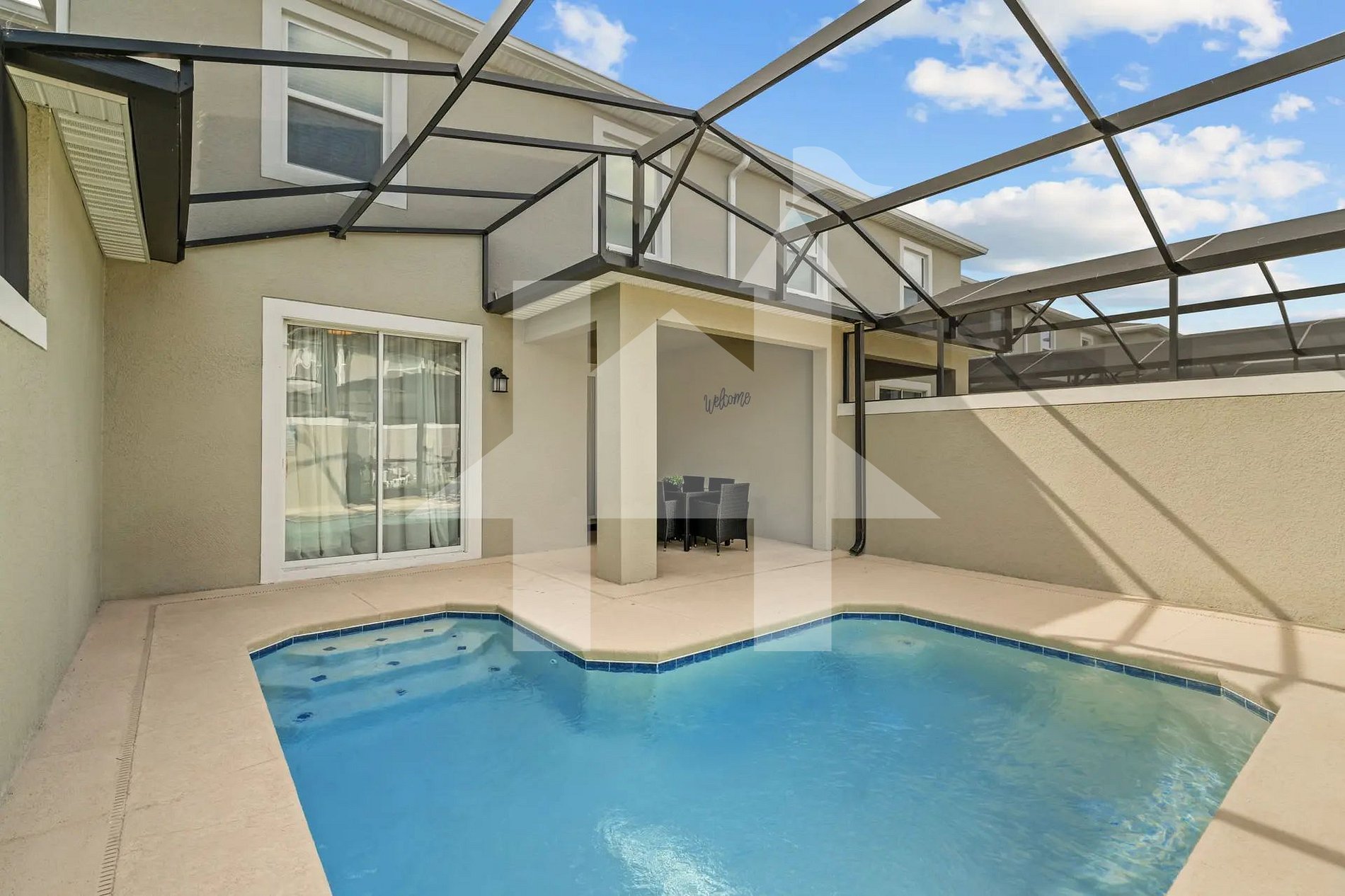 The open-concept living area offers a welcoming environment where the lounge seamlessly connects to the dining space and fully equipped kitchen. This layout makes it easy to cook, share meals, and spend quality time together. Step outside to your private screened patio with a refreshing pool that can be heated upon request—perfect for relaxing after a fun day at the parks.
