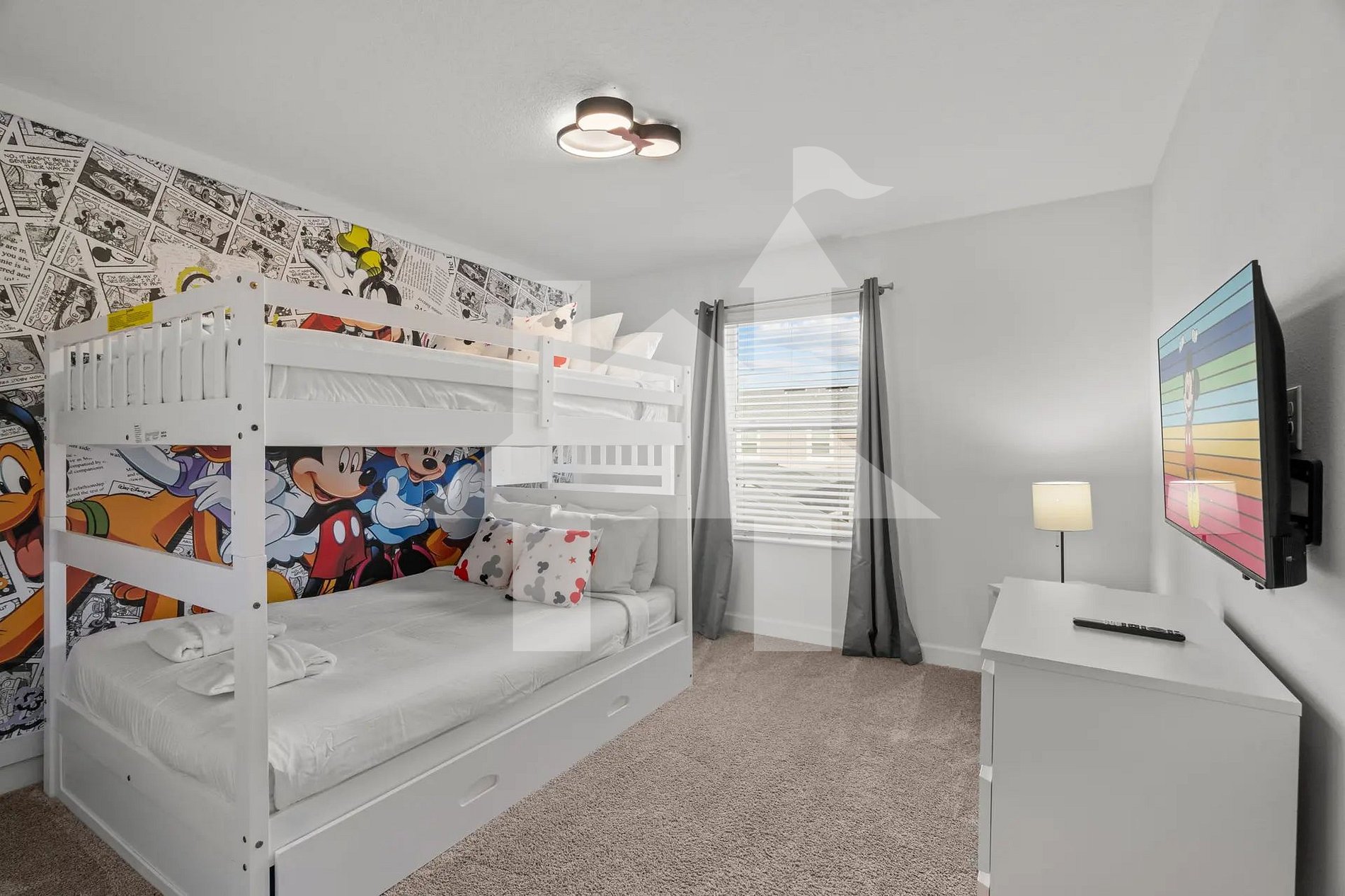 Second Floor: 1 spacious king suite with en-suite bathroom, plus 2 themed bedrooms. One is Mickey-inspired, and the other features a Star Wars design. Both include bunk beds with full mattresses and share a third full bathroom.