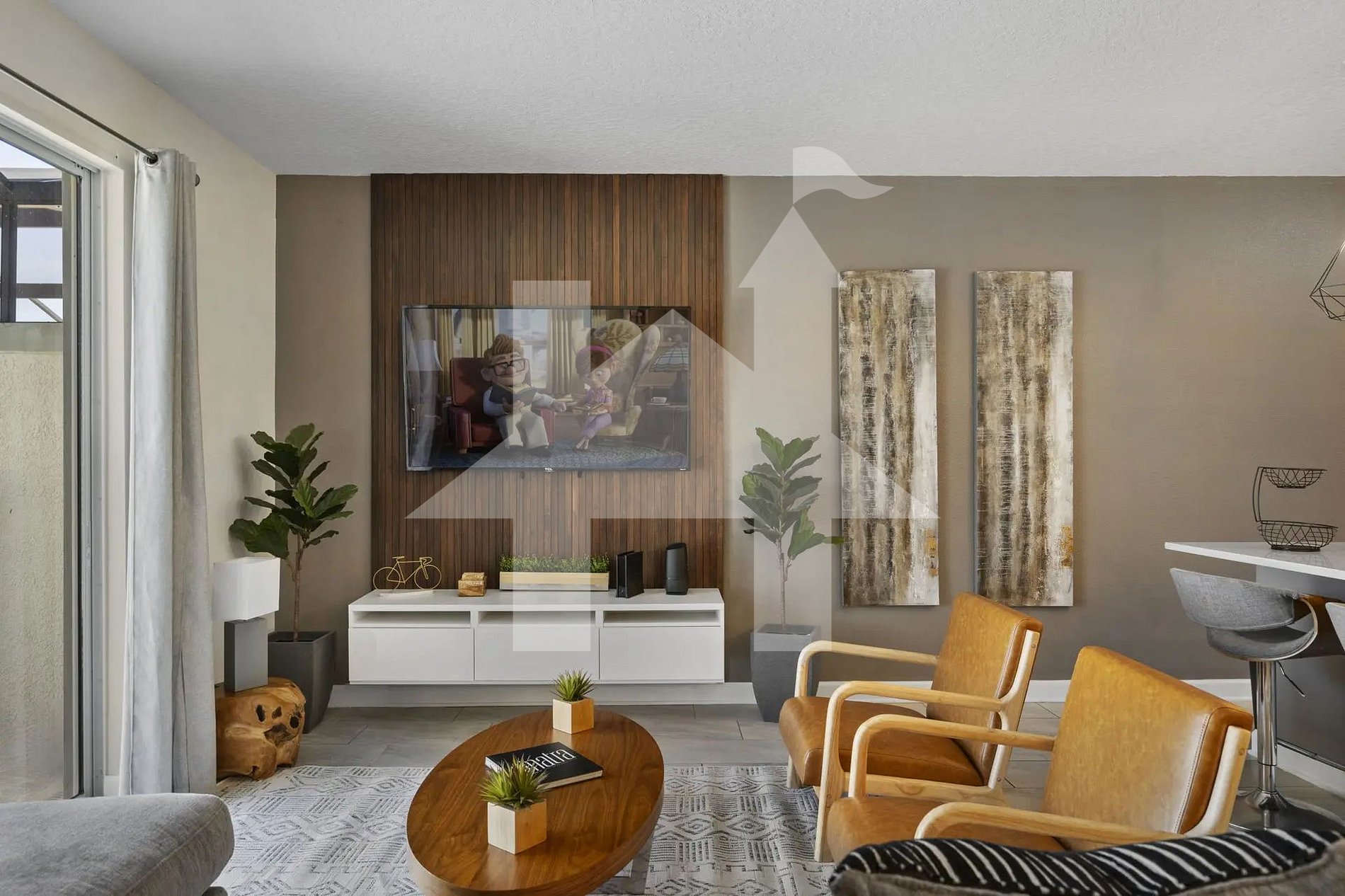 The open-concept interior creates a warm and inviting atmosphere. The living room offers plush seating and a smart TV, seamlessly flowing into the dining area and fully equipped kitchen. Cook delicious meals with modern appliances, including stove, oven, microwave, coffee maker, blender, and more. Gather around the large dining table to share meals and create unforgettable memories.