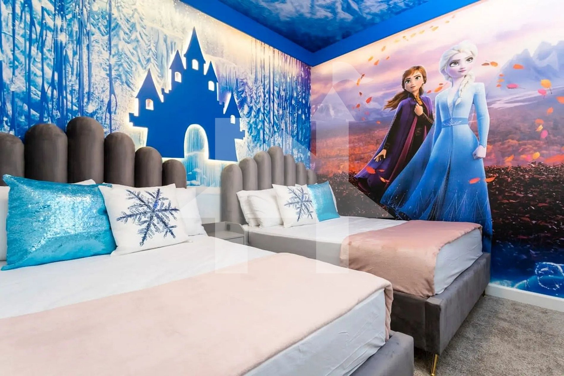 Bedroom 2 (First Floor) – Frozen-themed | Two Full Beds | Shares a bathroom