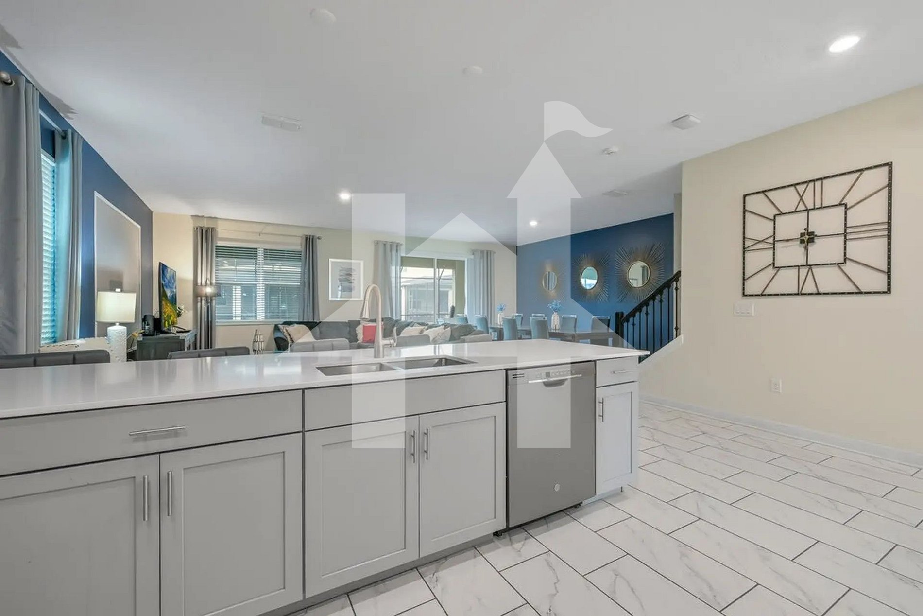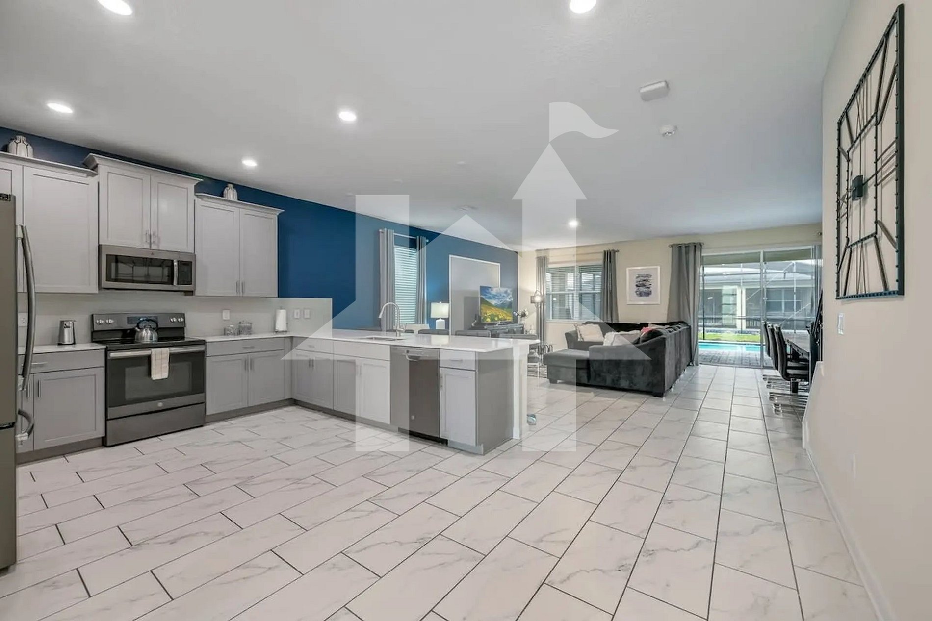 The home features an open-concept design with a spacious living area, elegant dining space, and a fully equipped kitchen with modern appliances—perfect for preparing meals and gathering together.