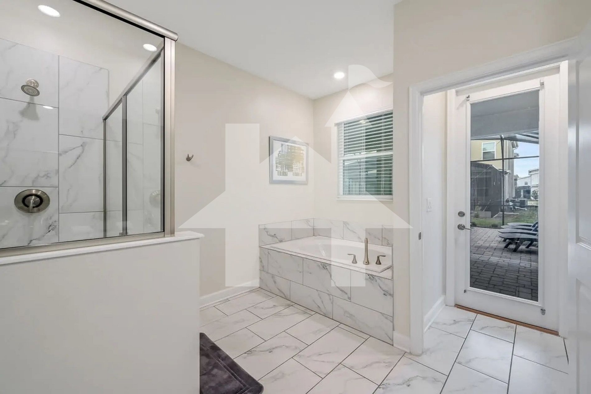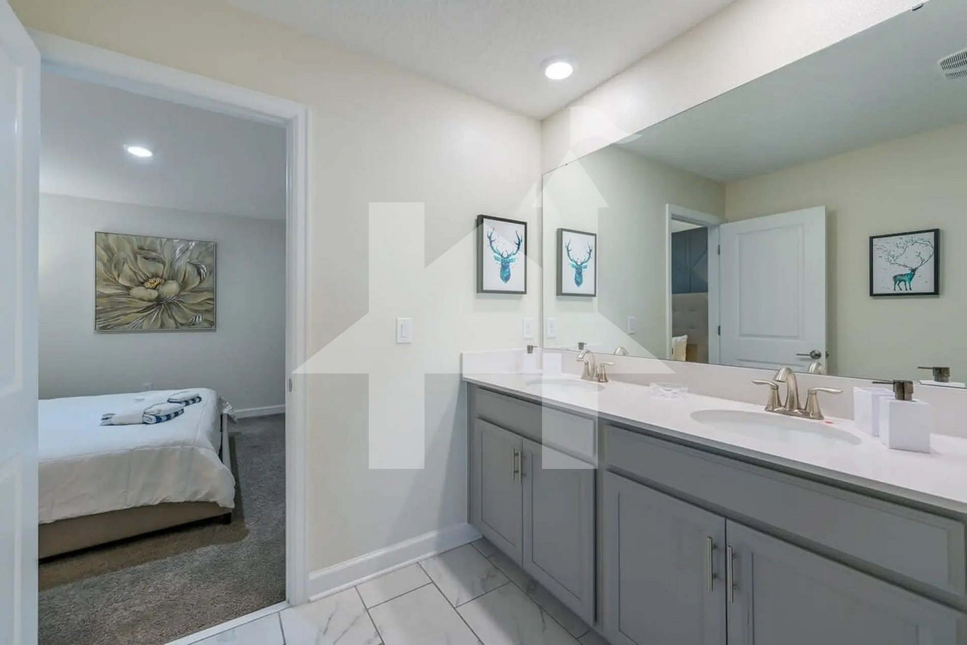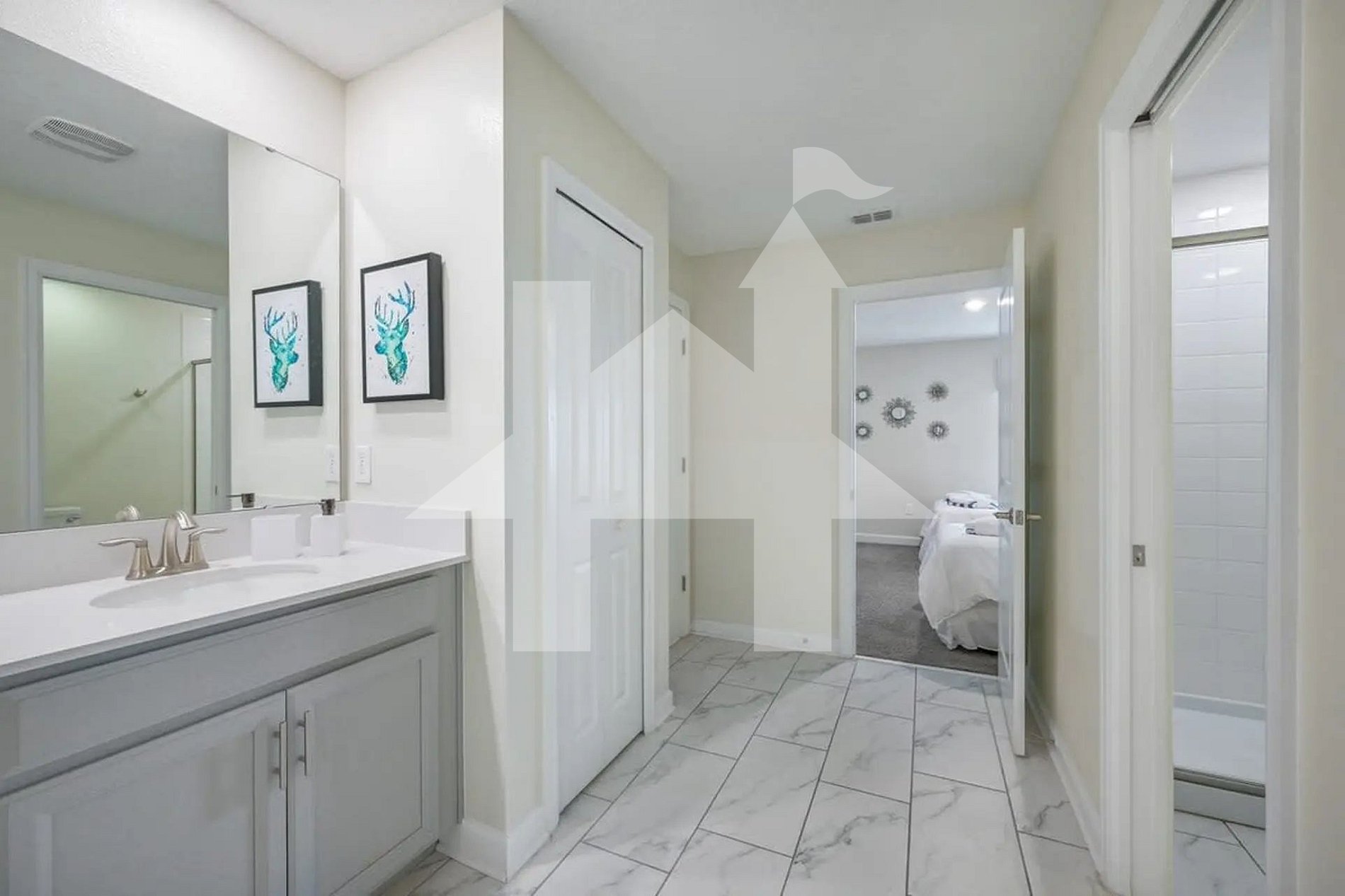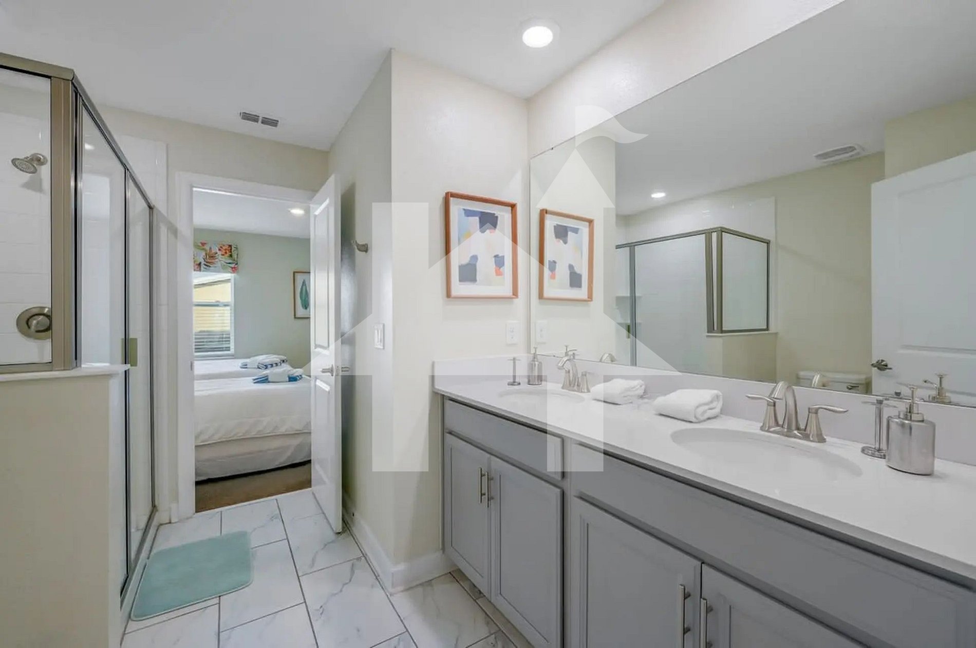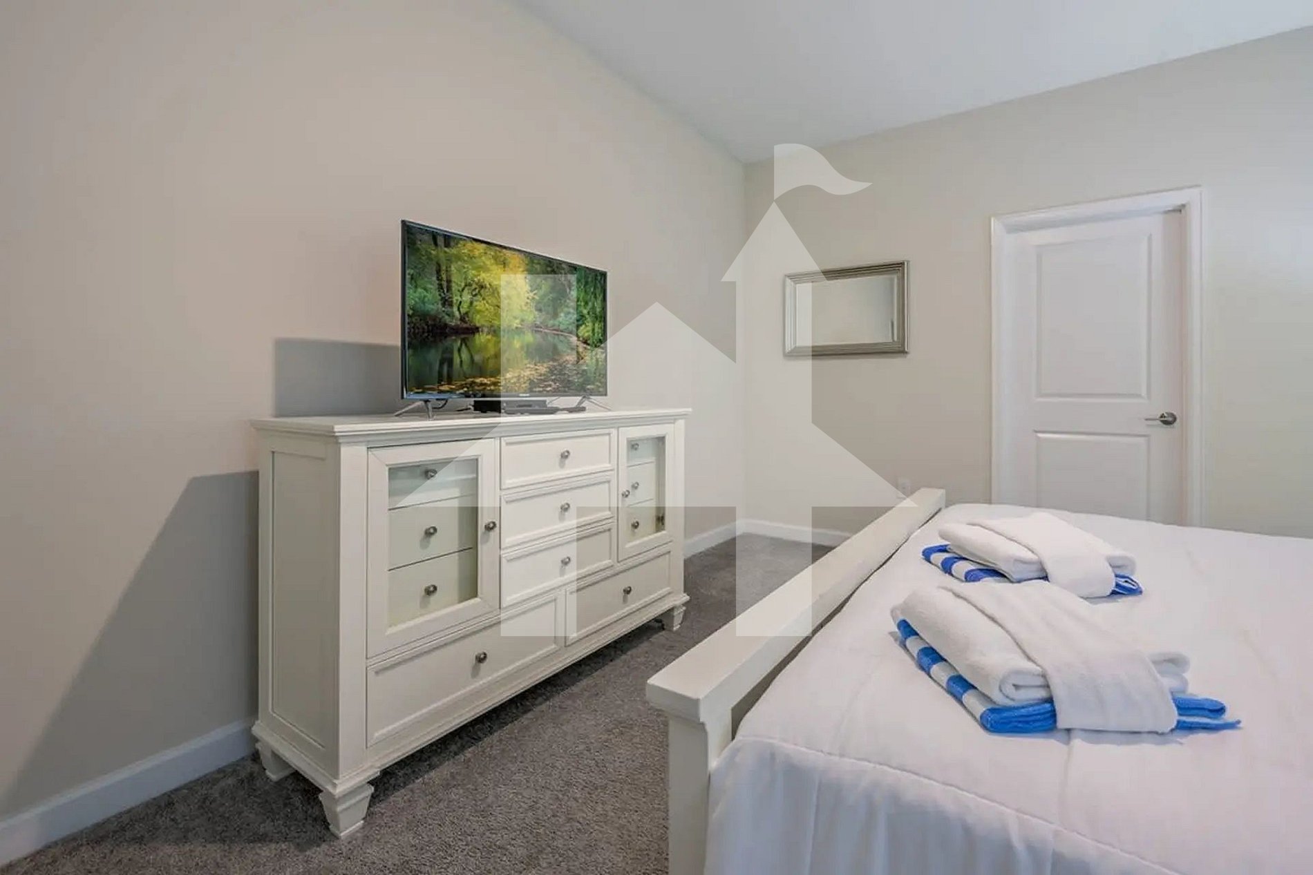 Guests have full access to the house and resort common areas, including the clubhouse with resort-style pool, lazy river, water slides, tiki bar, fitness center, mini-golf, and more.
