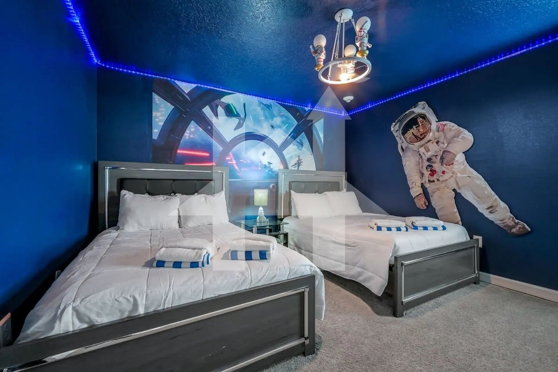 The immersive game room is designed for entertainment, offering fun for both kids and adults. Themed bedrooms add a special touch to your stay, making every night feel like part of the adventure.