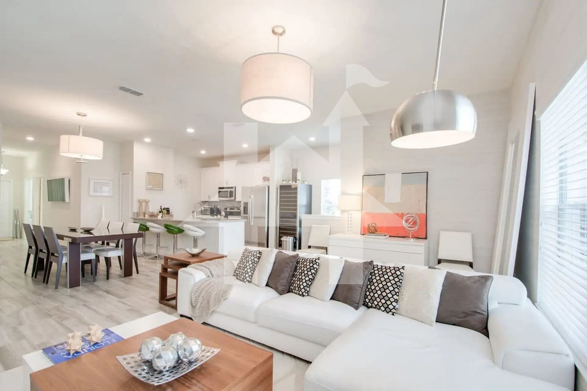 Step into a warm and modern living room seamlessly connected to the dining area and a fully equipped kitchen. The open layout is ideal for family gatherings, shared meals, or unwinding after a fun-filled day at the parks.