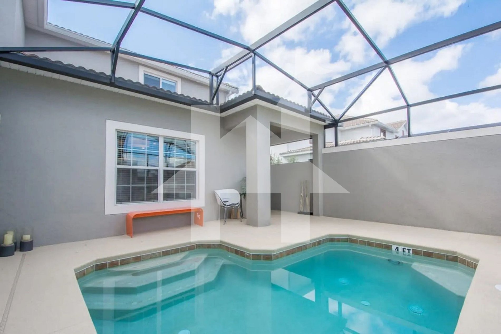 Enjoy relaxing moments outdoors in the screened patio featuring a private heatable pool (heating available for an additional fee). Whether sunbathing, swimming, or dining al fresco, this outdoor area is perfect for all ages.