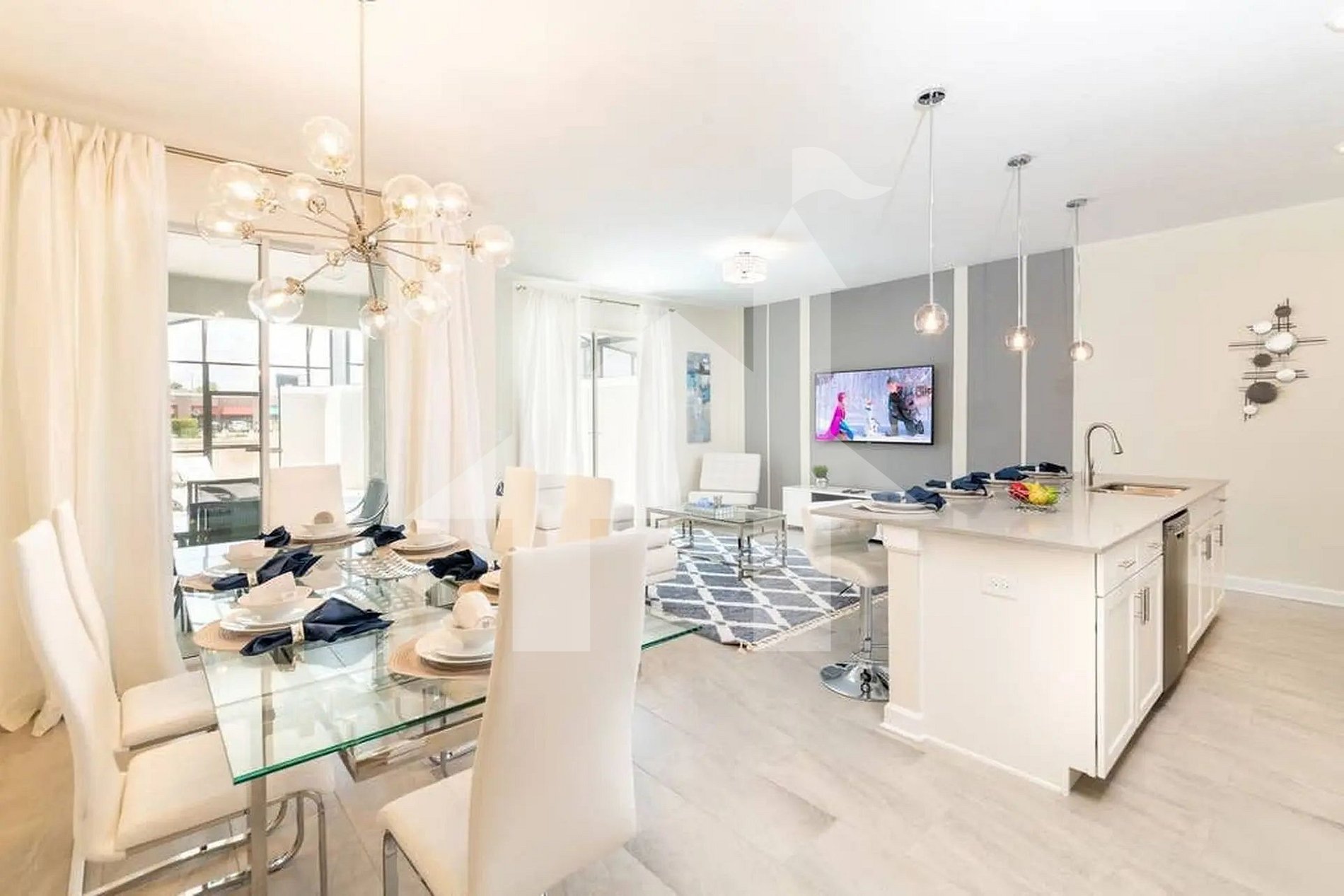 Step into a bright, open-concept living space where the modern kitchen, inviting dining area, and spacious living room blend seamlessly to create the perfect atmosphere for relaxing and making memories. Slide open the patio doors and step outside to your private, heatable pool—a tranquil oasis to enjoy after an exciting day at the theme parks.