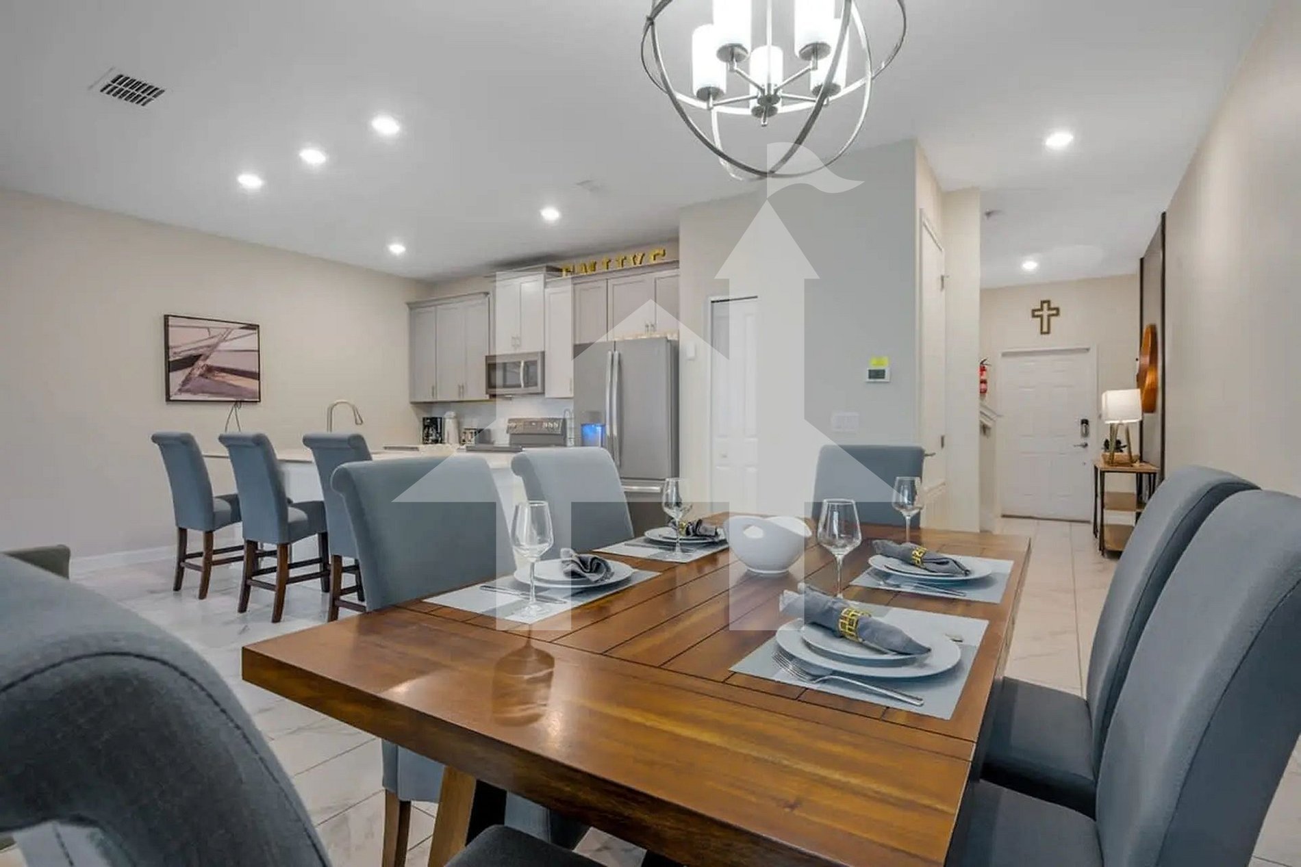 Step into this bright and spacious 4-bedroom, 3-bathroom townhome at the exclusive Champions Gate Resort, designed to comfortably accommodate families and groups. The open-plan living area integrates a cozy lounge with Smart TV, a dining space for family meals, and a fully equipped kitchen with modern appliances, cookware, and utensils—perfect for preparing everything from snacks to full dinners.