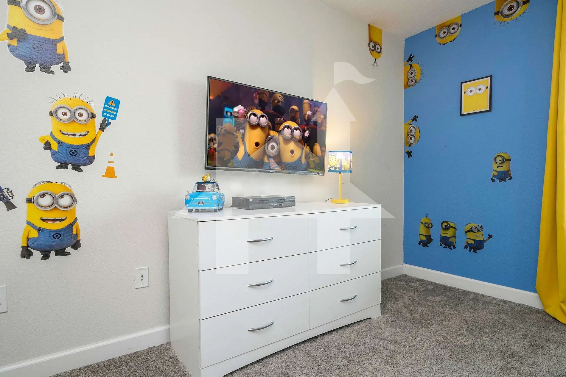 Themed Minions Room: 2 Full beds + 1 Twin trundle bed — colorful and playful