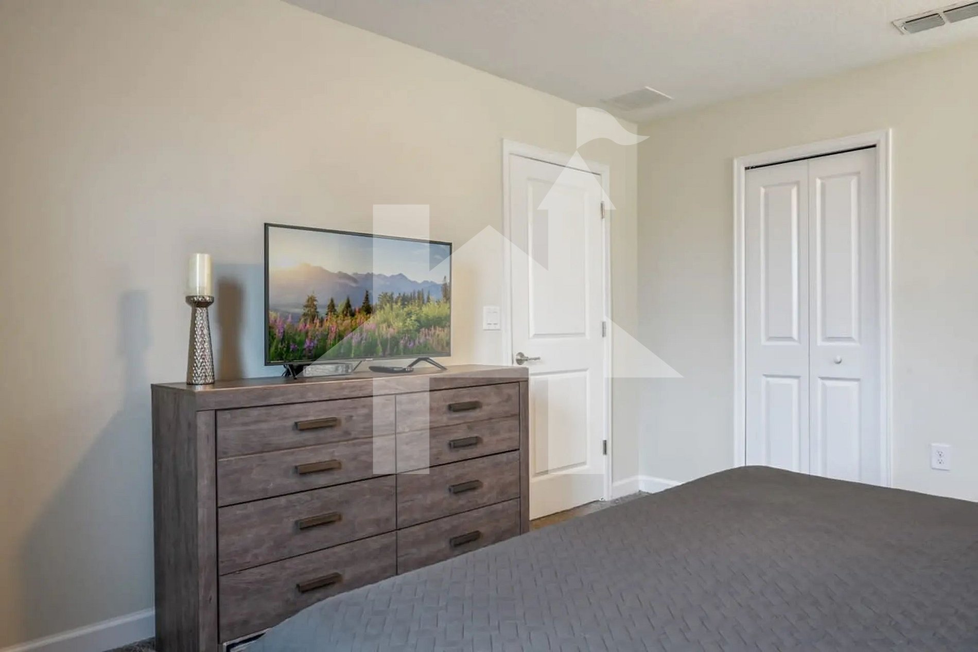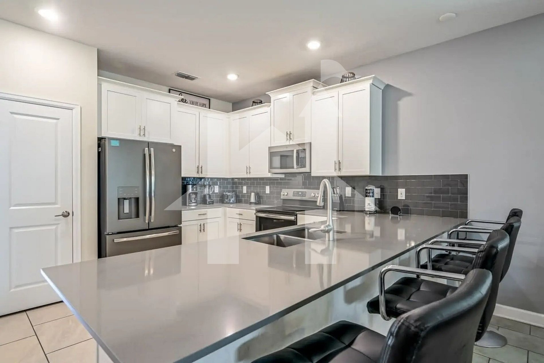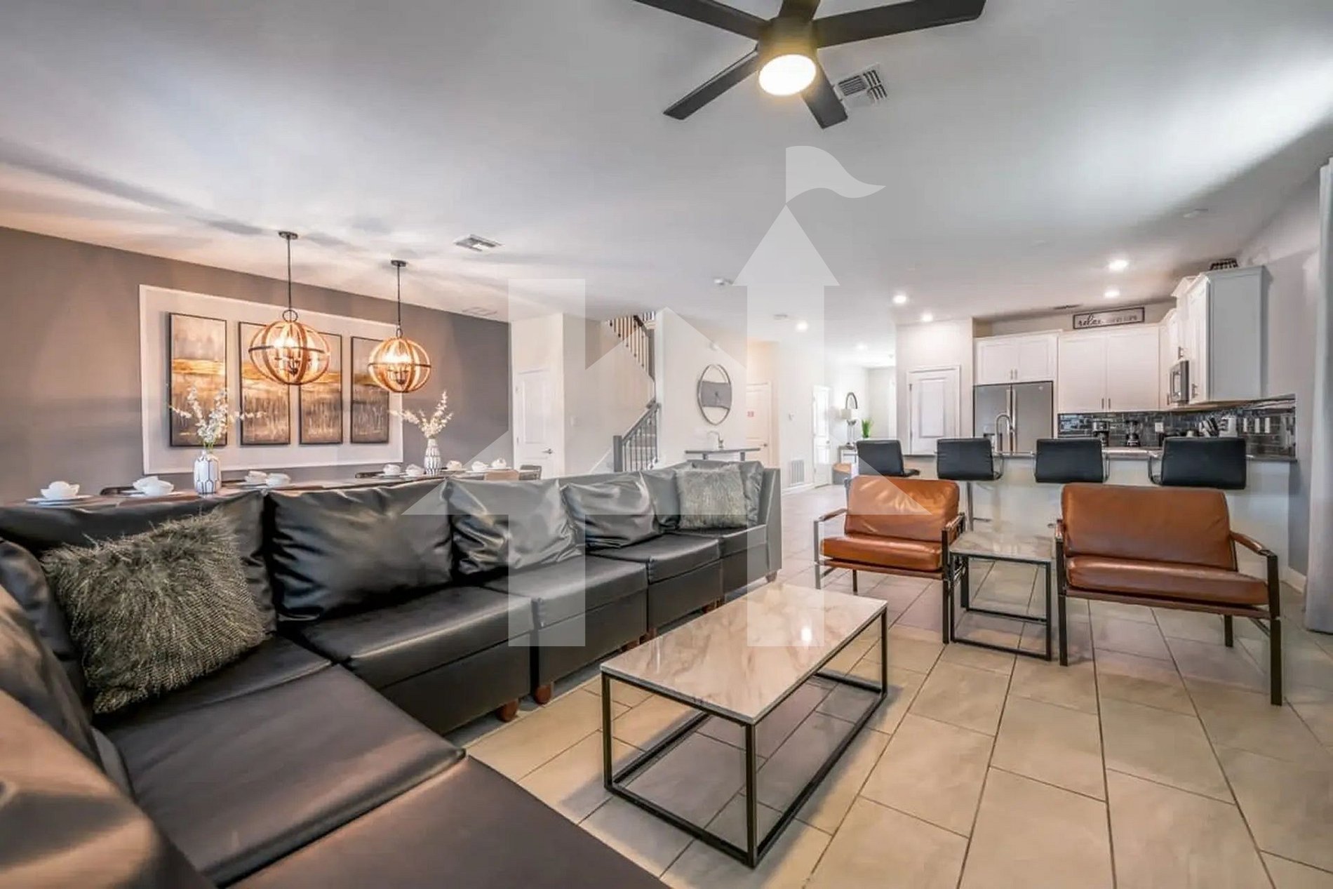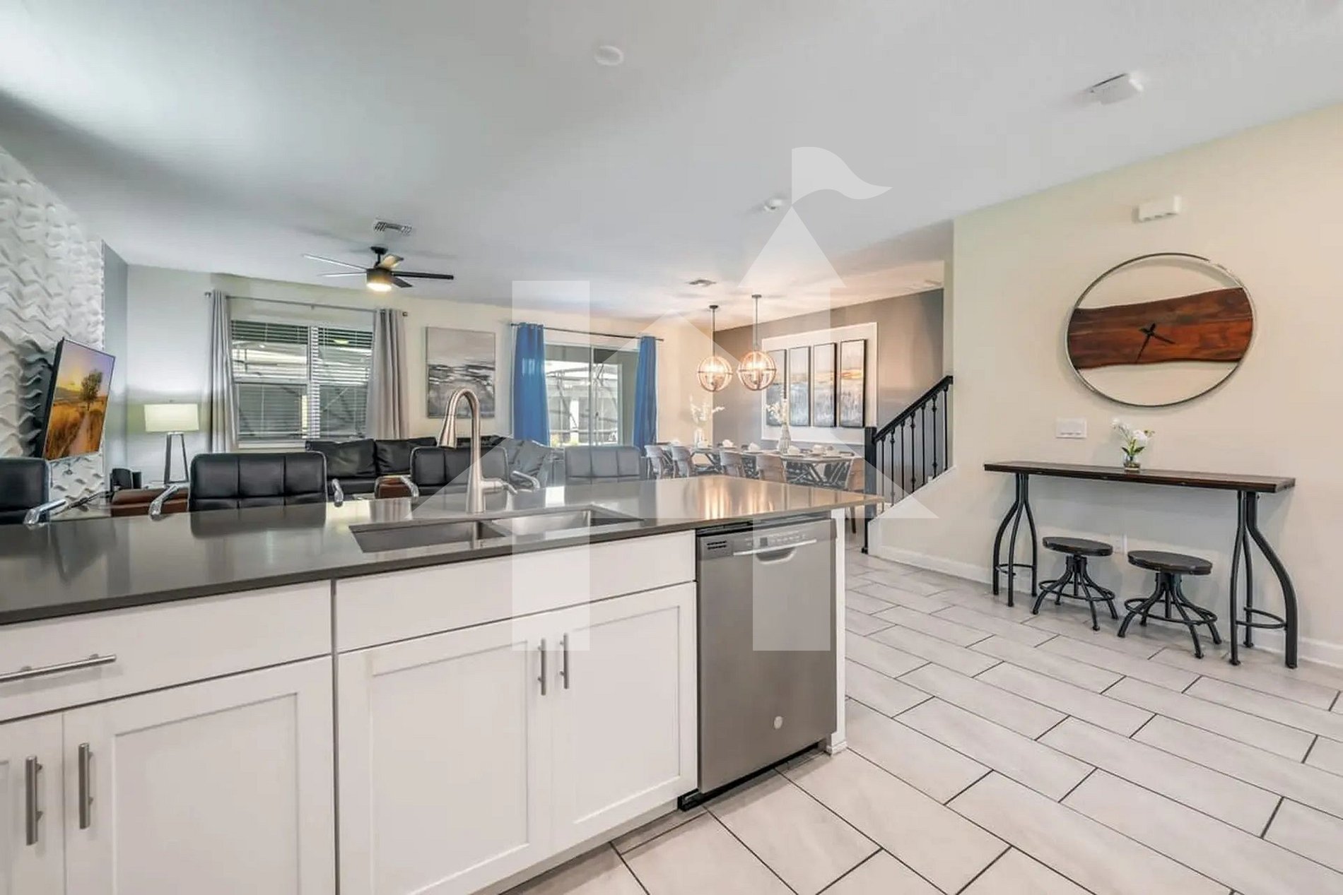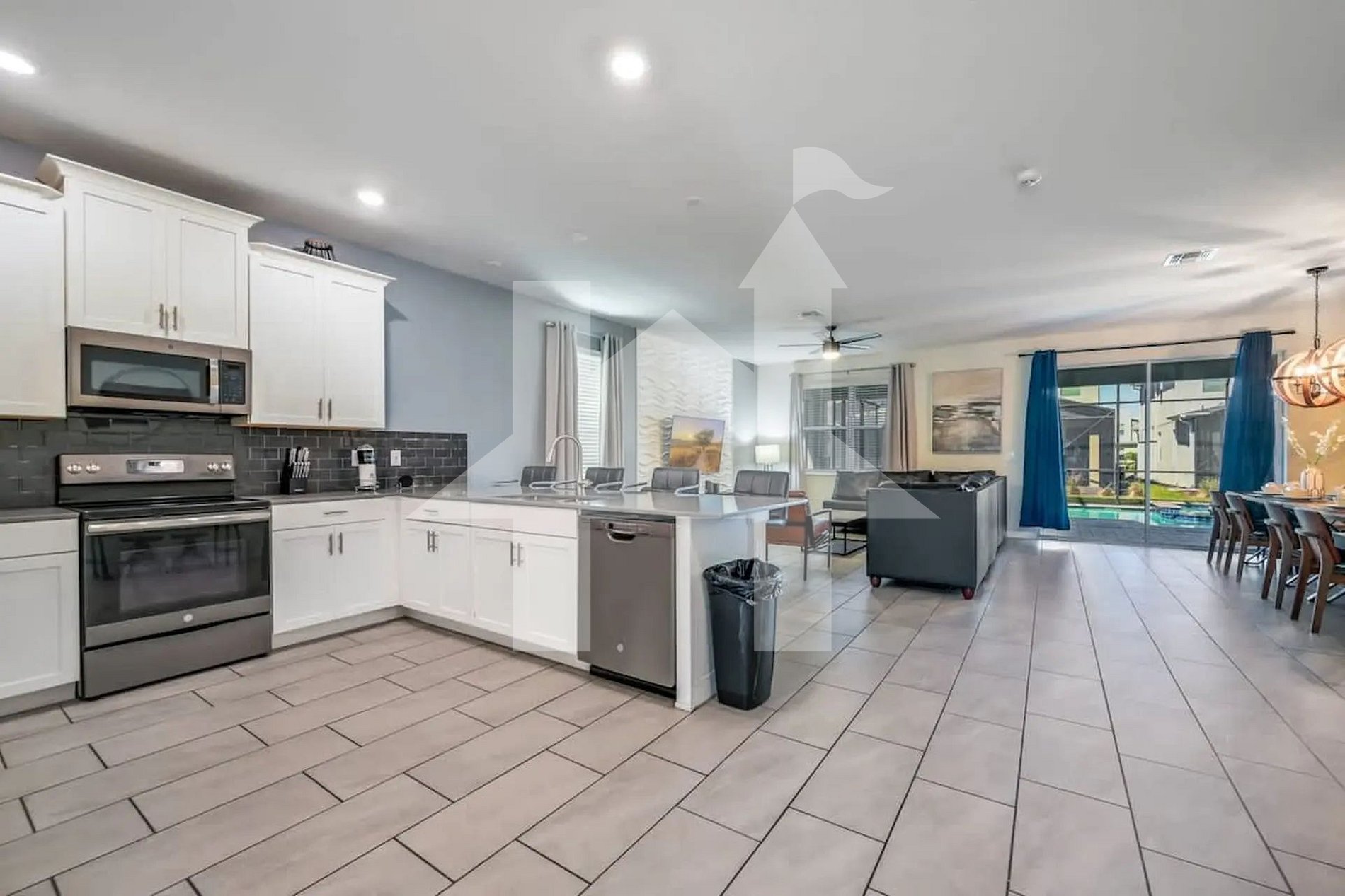 The heart of the home is its modern open-concept living area, where the fully equipped kitchen flows seamlessly into the elegant dining space and cozy lounge. Ideal for gathering after a day at the parks, this space is perfect for family meals, movie nights, or simply relaxing together.