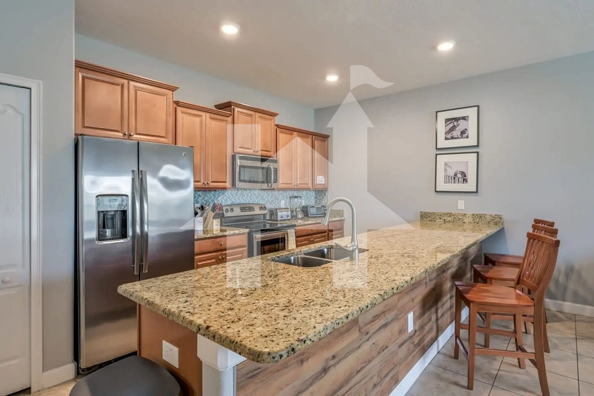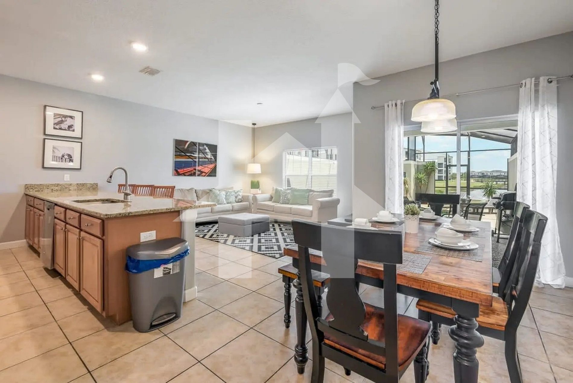 Inside, the home offers a spacious open-concept layout that combines style and practicality. The living room features comfortable seating and a flat-screen Smart TV, perfect for movie nights or catching up on your favorite shows. The dining area provides ample seating for family meals, while the fully equipped kitchen comes with stainless steel appliances, cookware, and utensils—everything you need to prepare anything from a quick breakfast to a full family dinner.