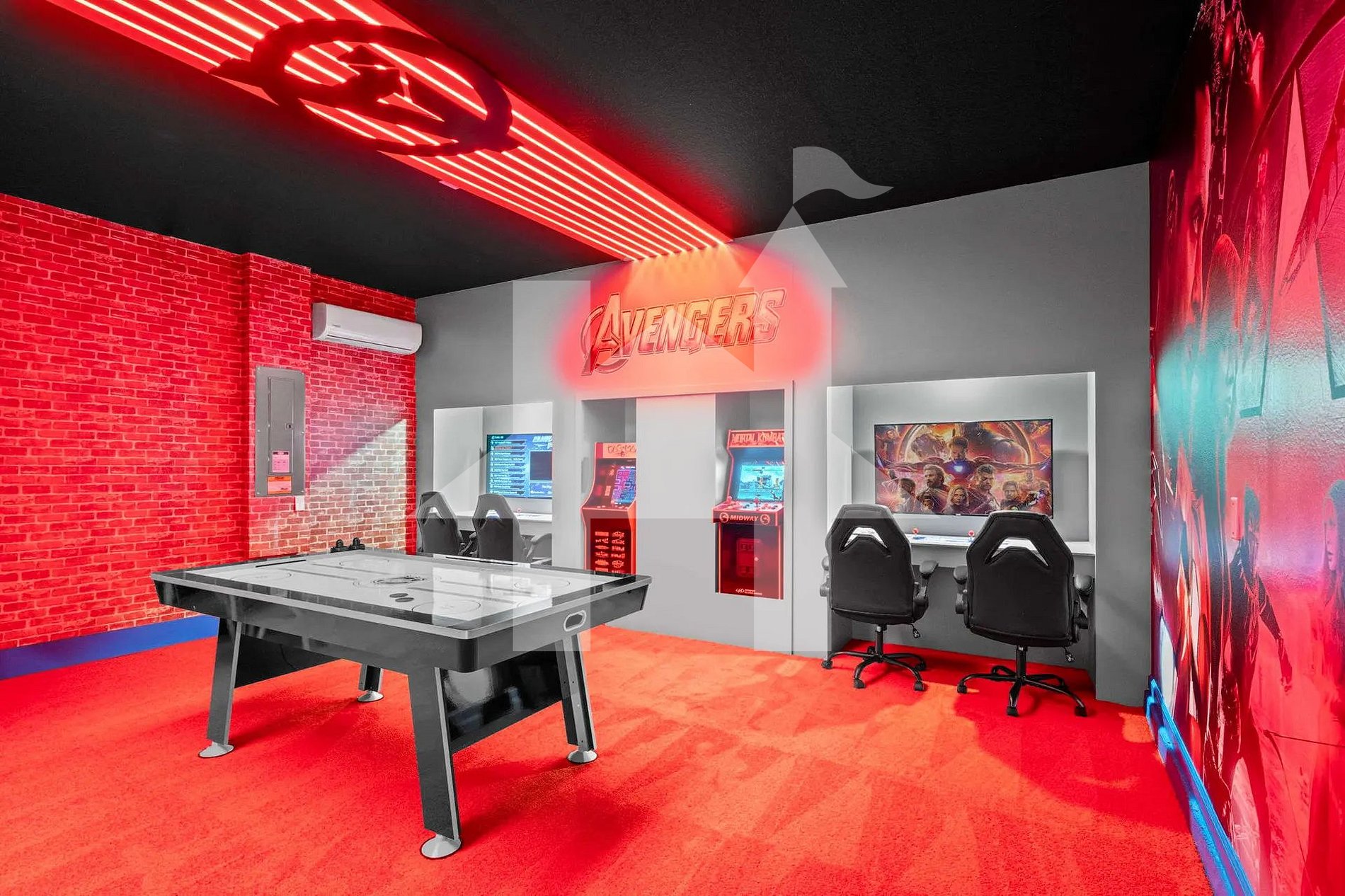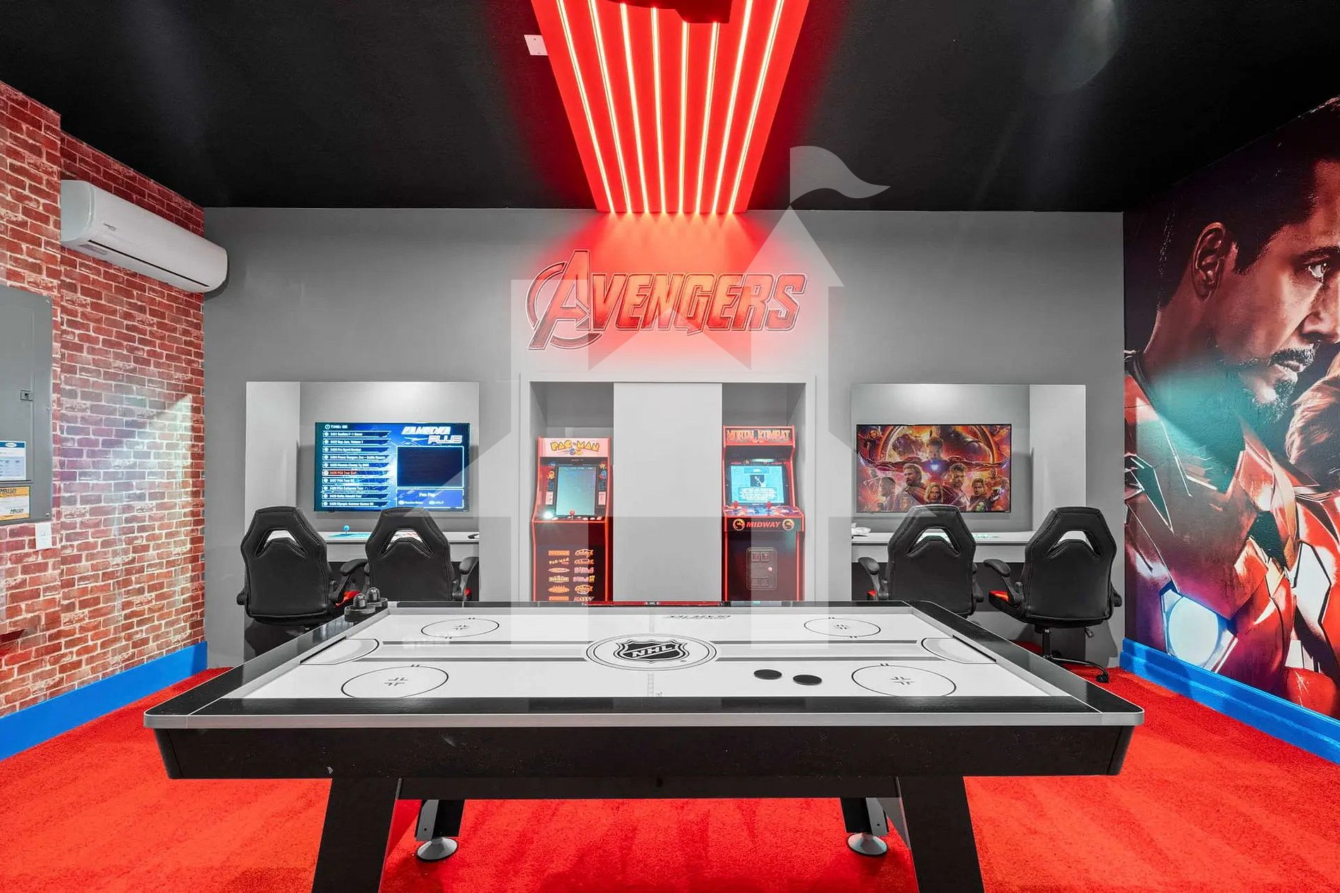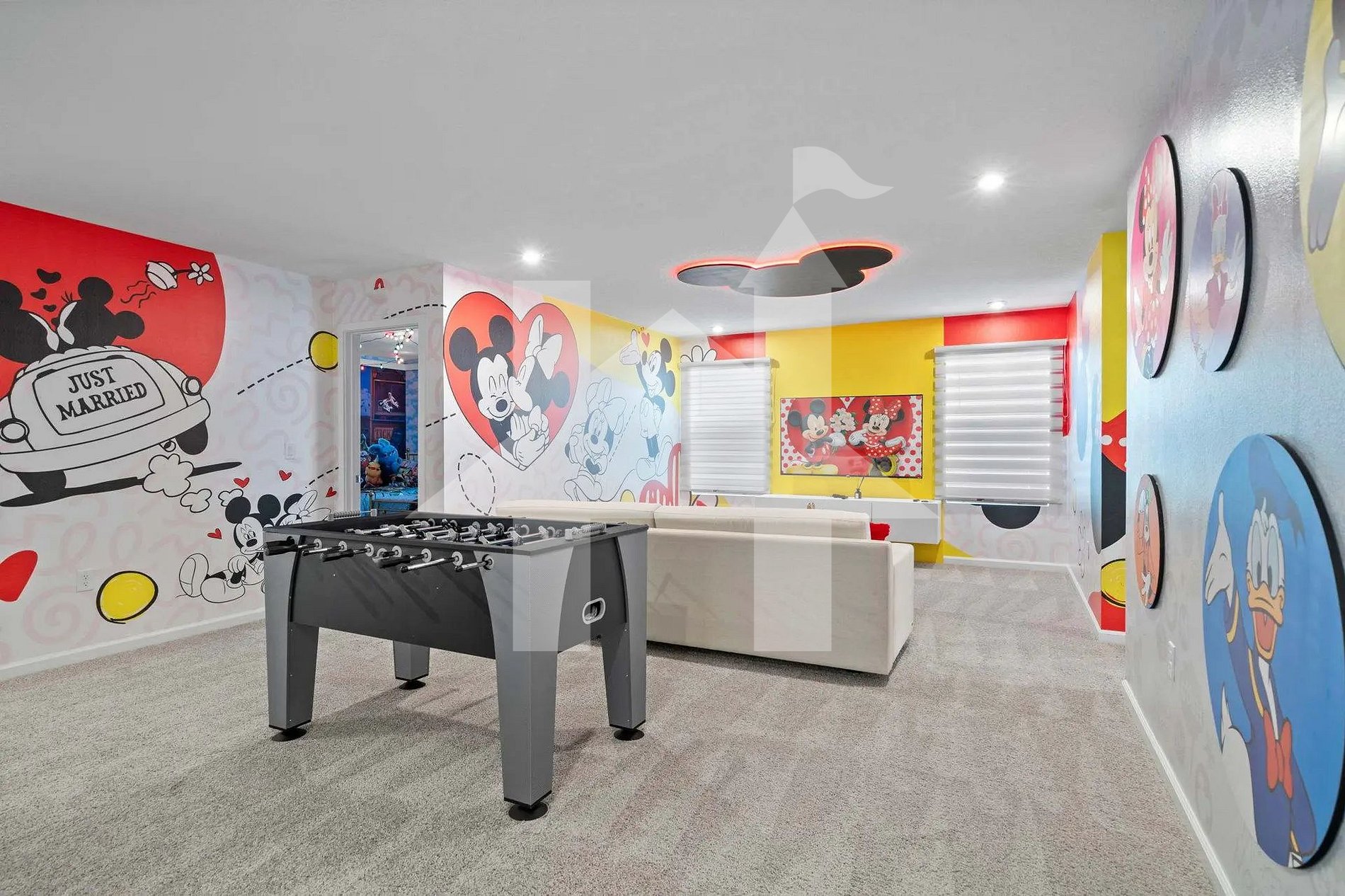 Upstairs, you’ll find a vibrant Mickey-themed family room with a foosball table for endless fun. This floor includes: