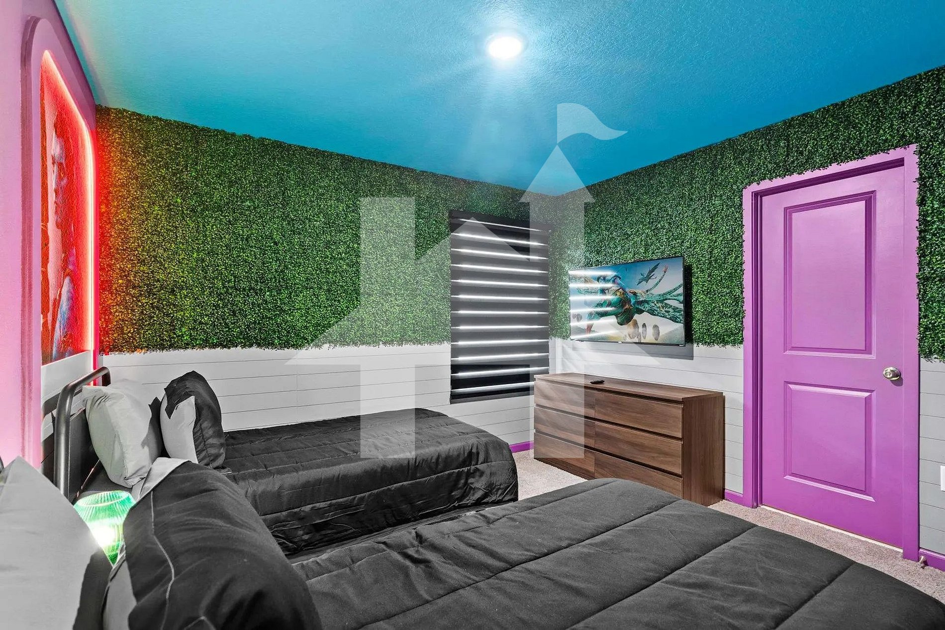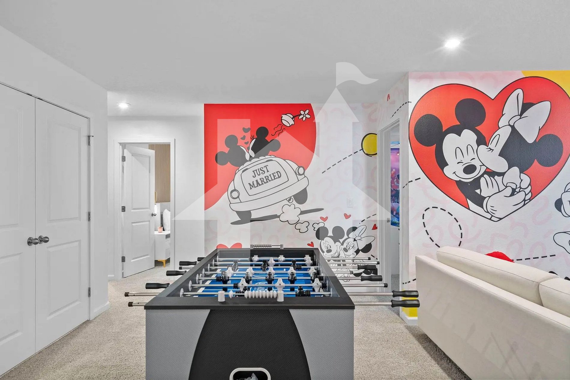 Upstairs, you’ll find a vibrant Mickey-themed family room with a foosball table for endless fun. This floor includes: