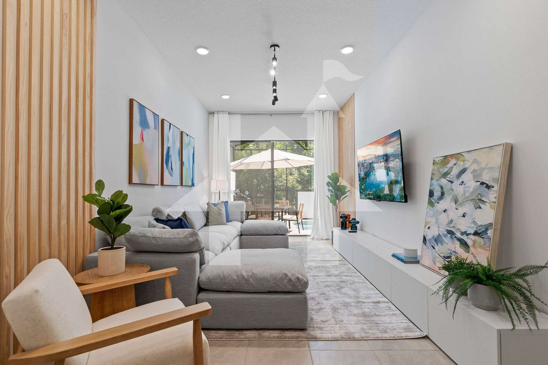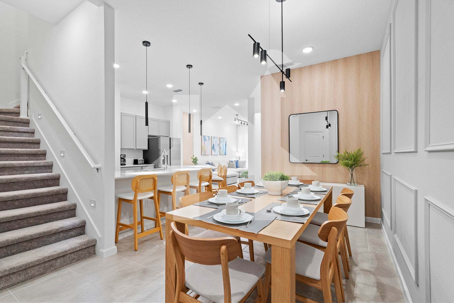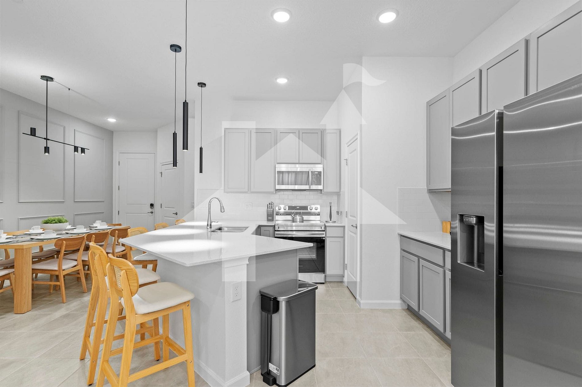 The open floor plan connects the living room, dining area, and fully equipped gourmet kitchen, creating a modern and welcoming space. Designer furnishings and natural lighting enhance the relaxing ambiance.