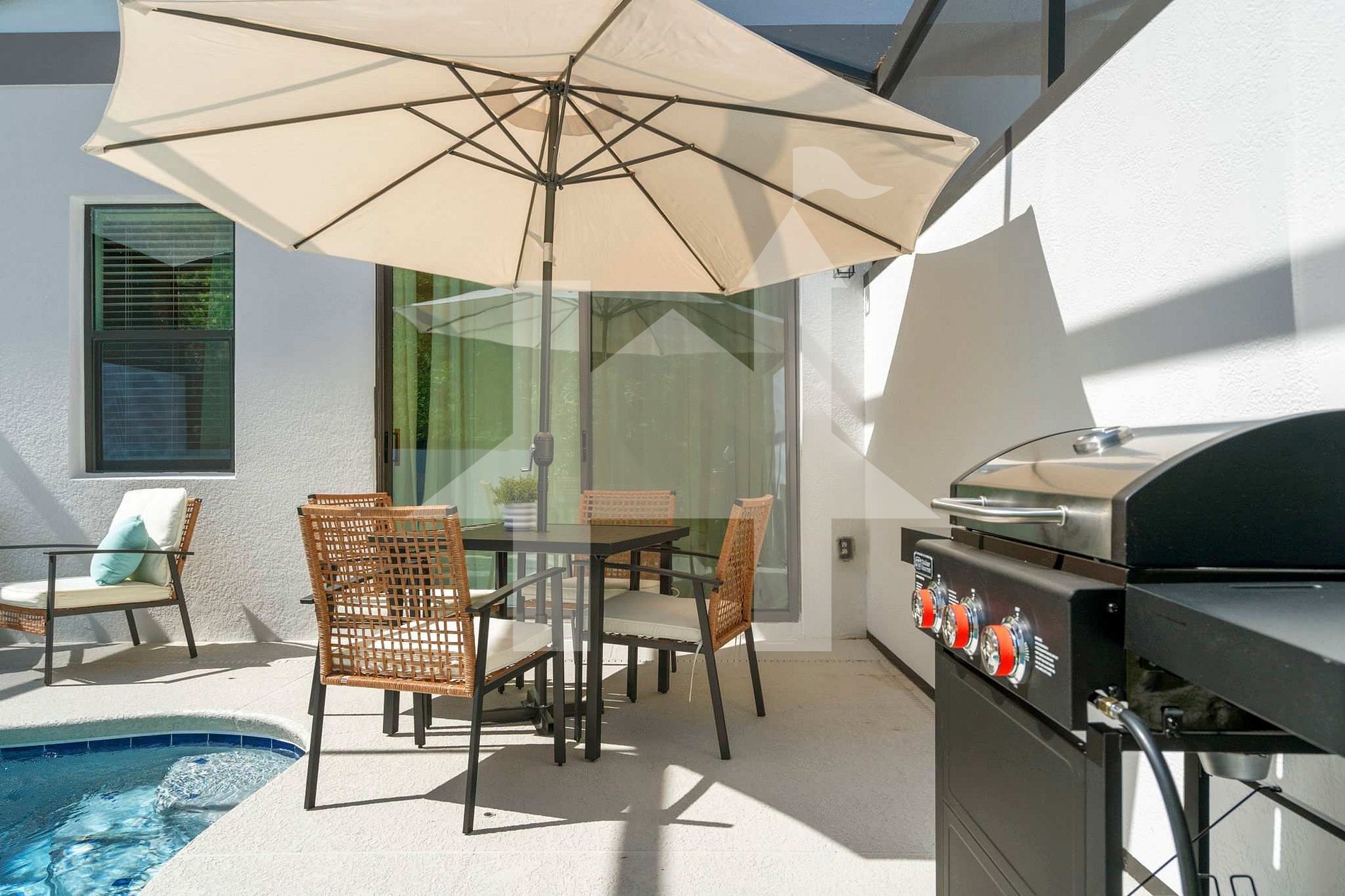 The outdoor area features a private, heatable pool with loungers for relaxing after a day at the parks. Pool heating and BBQ grill usage are available for an extra fee.