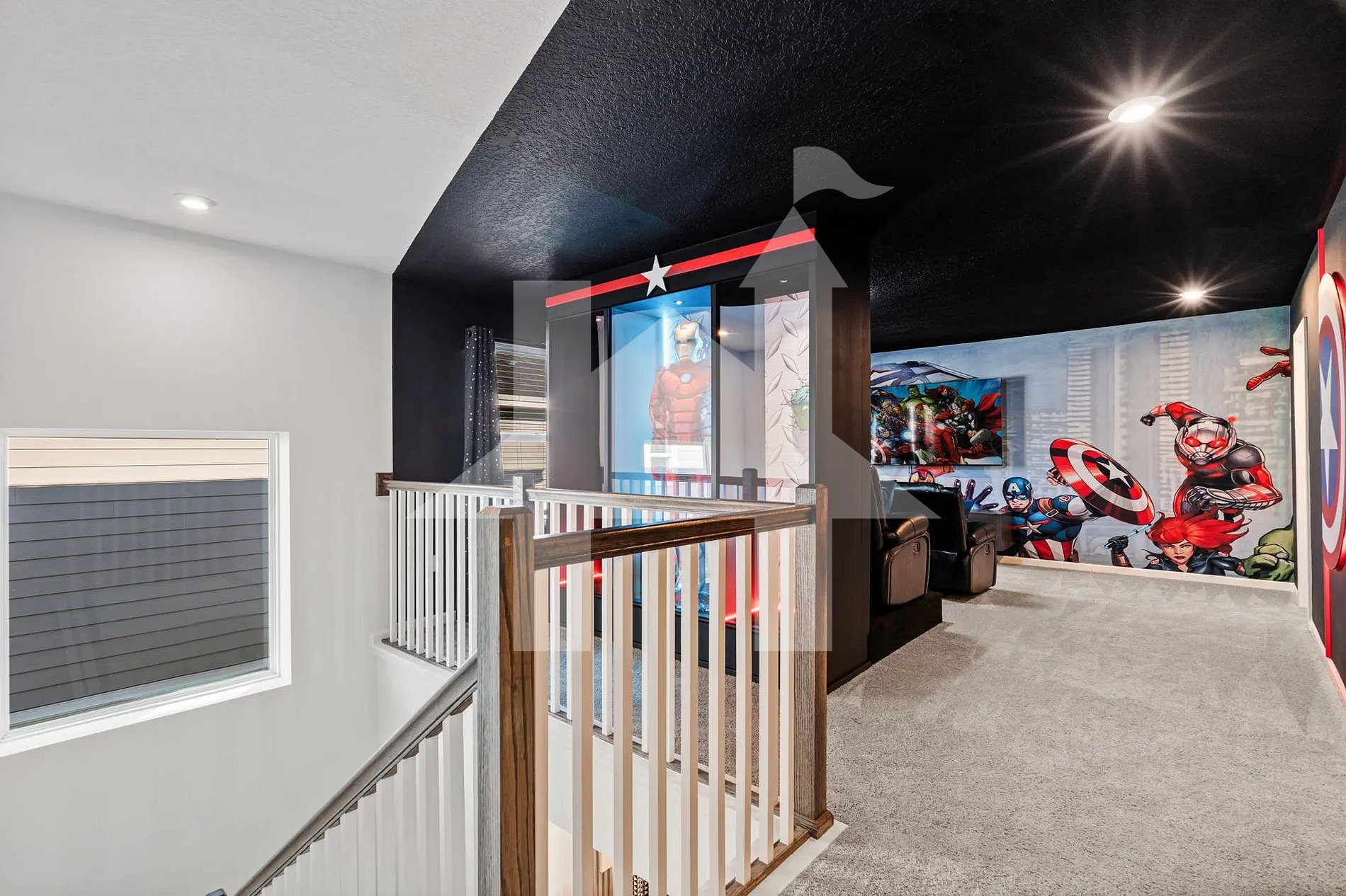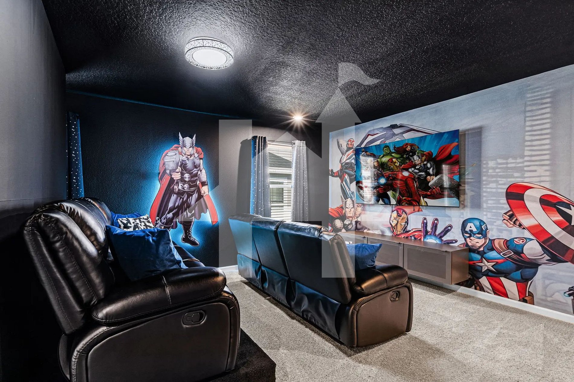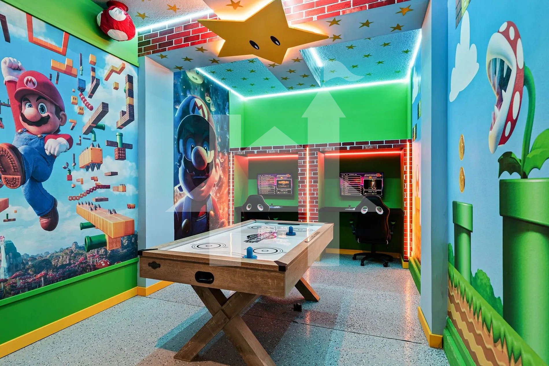 Just 15 minutes from Disney, this 6‑bedroom, 4.5‑bath villa at Solara Resort welcomes up to 14 guests with a private heated pool & spa, themed bedrooms (Minions, Harry Potter, The Little Mermaid), a Mario Bros game room and Avengers home theater. Full kitchen, laundry, free WiFi, parking and resort amenities including surf simulator, clubhouse and gym. Ideal for families and groups seeking fun and comfort.