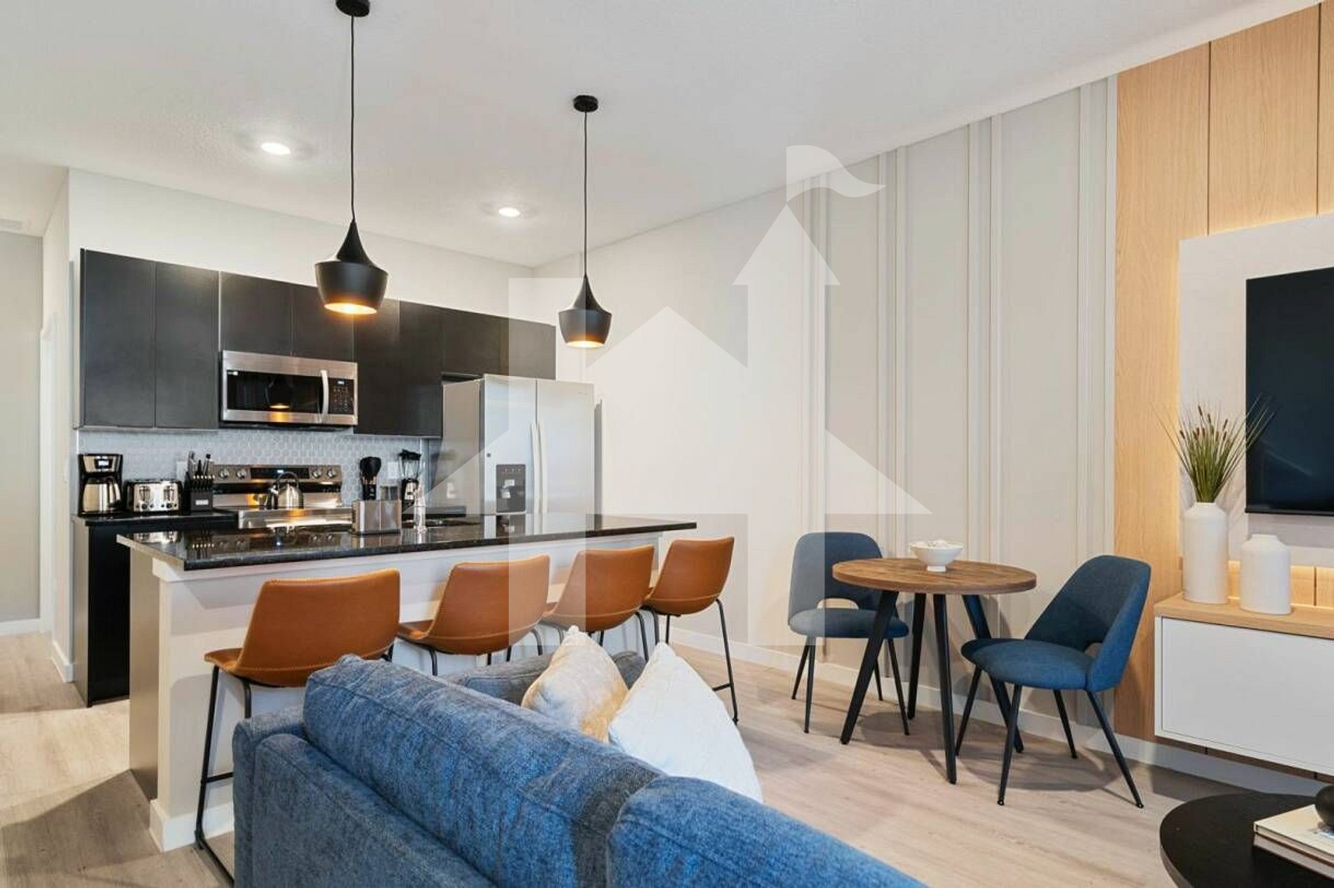 The open-concept floor plan seamlessly connects the fully equipped kitchen, dining, and living areas, creating a spacious and inviting atmosphere where everyone can cook, dine, and relax together.