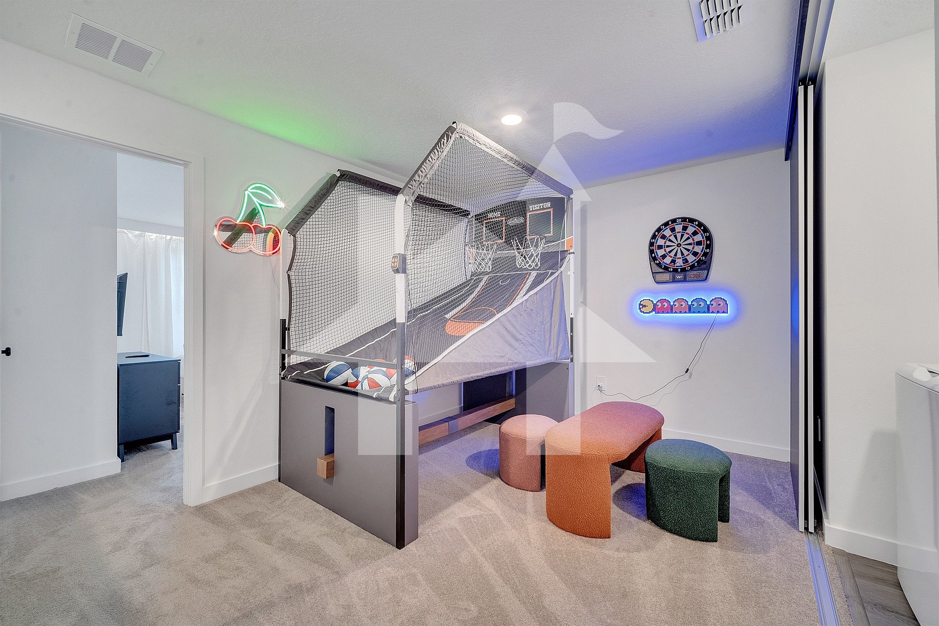 The upstairs game nook features a basketball arcade game, electronic dartboard, neon decor, and cozy seating. There's also a private work area with a desk and printer for remote work.