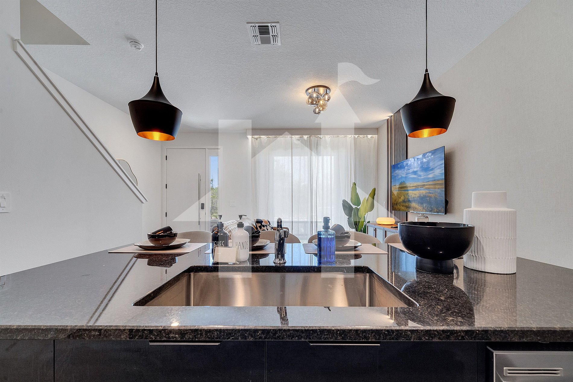 The modern kitchen is fully stocked and open to the dining and living areas. Enjoy meals at the breakfast bar or relax on the sofa with a 55” Smart TV.