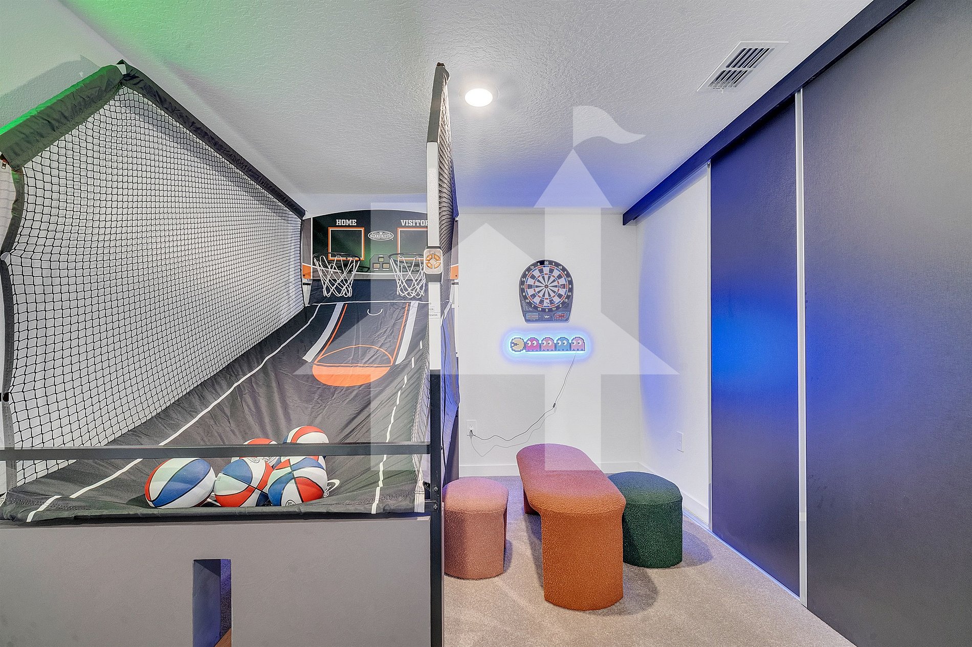 The upstairs game nook features a basketball arcade game, electronic dartboard, neon decor, and cozy seating. There's also a private work area with a desk and printer for remote work.
