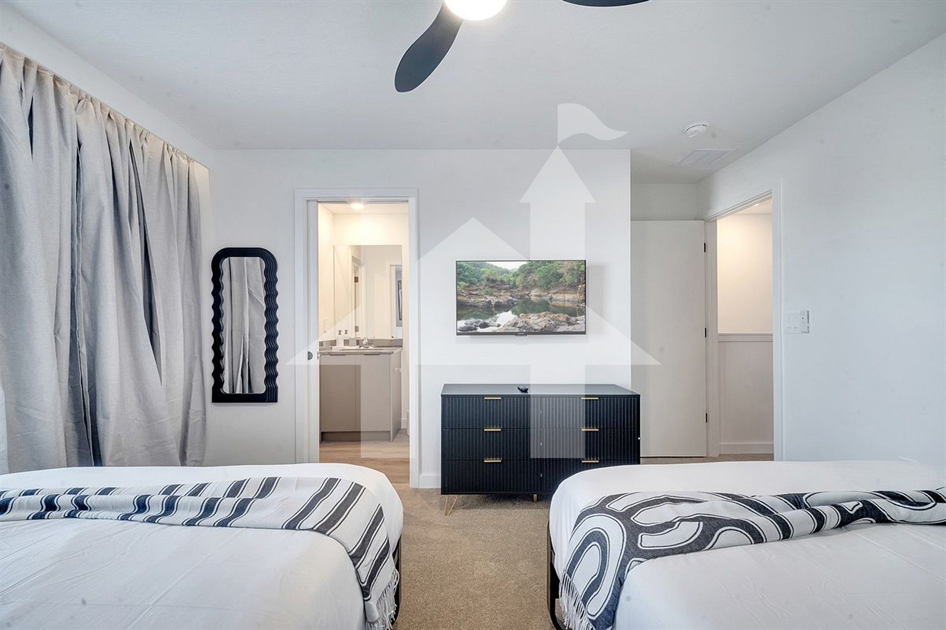 Quarto com cama king-size, Smart TV e banheiro completo compartilhado