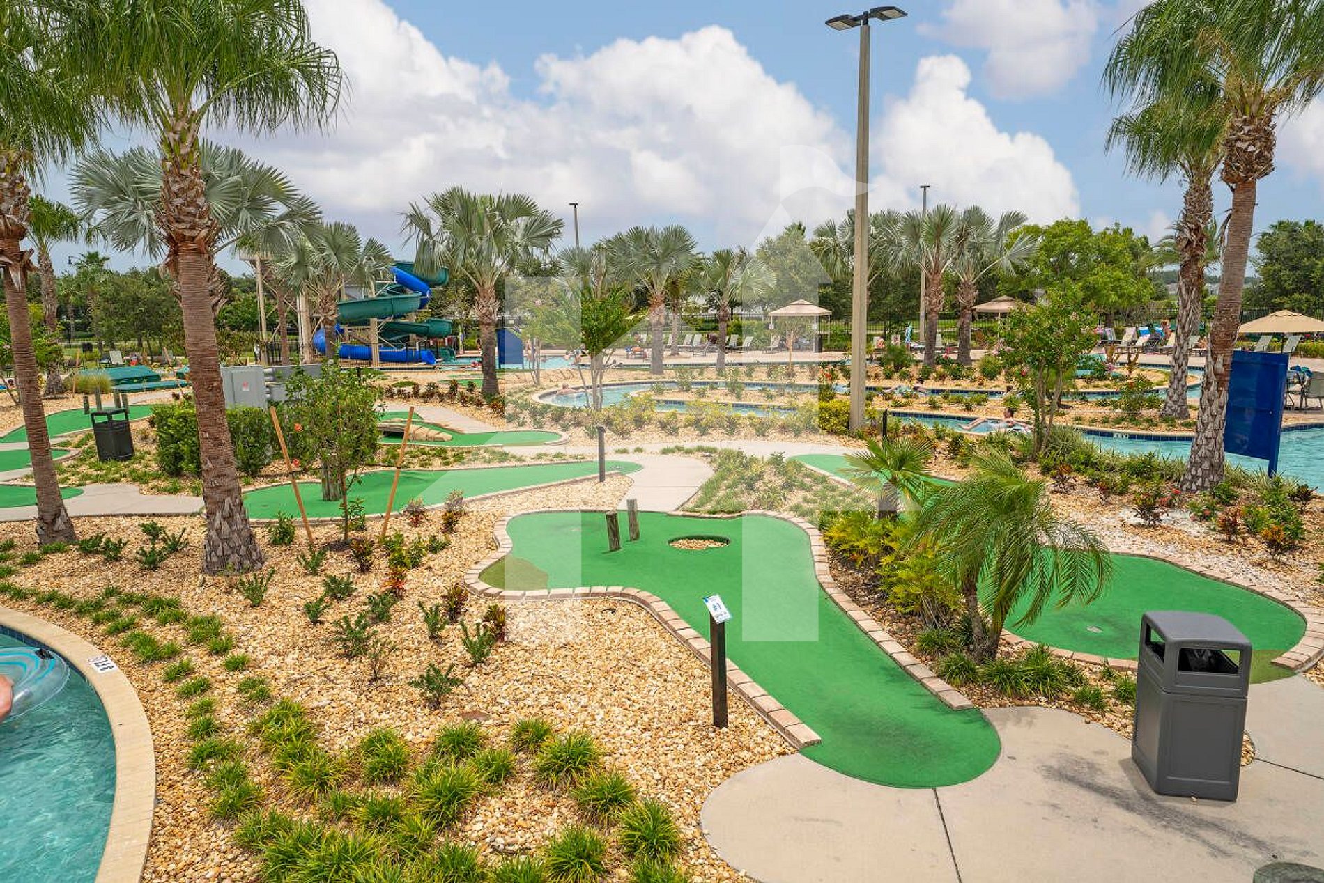 Piscinas estilo resort com escorregadores e área infantil