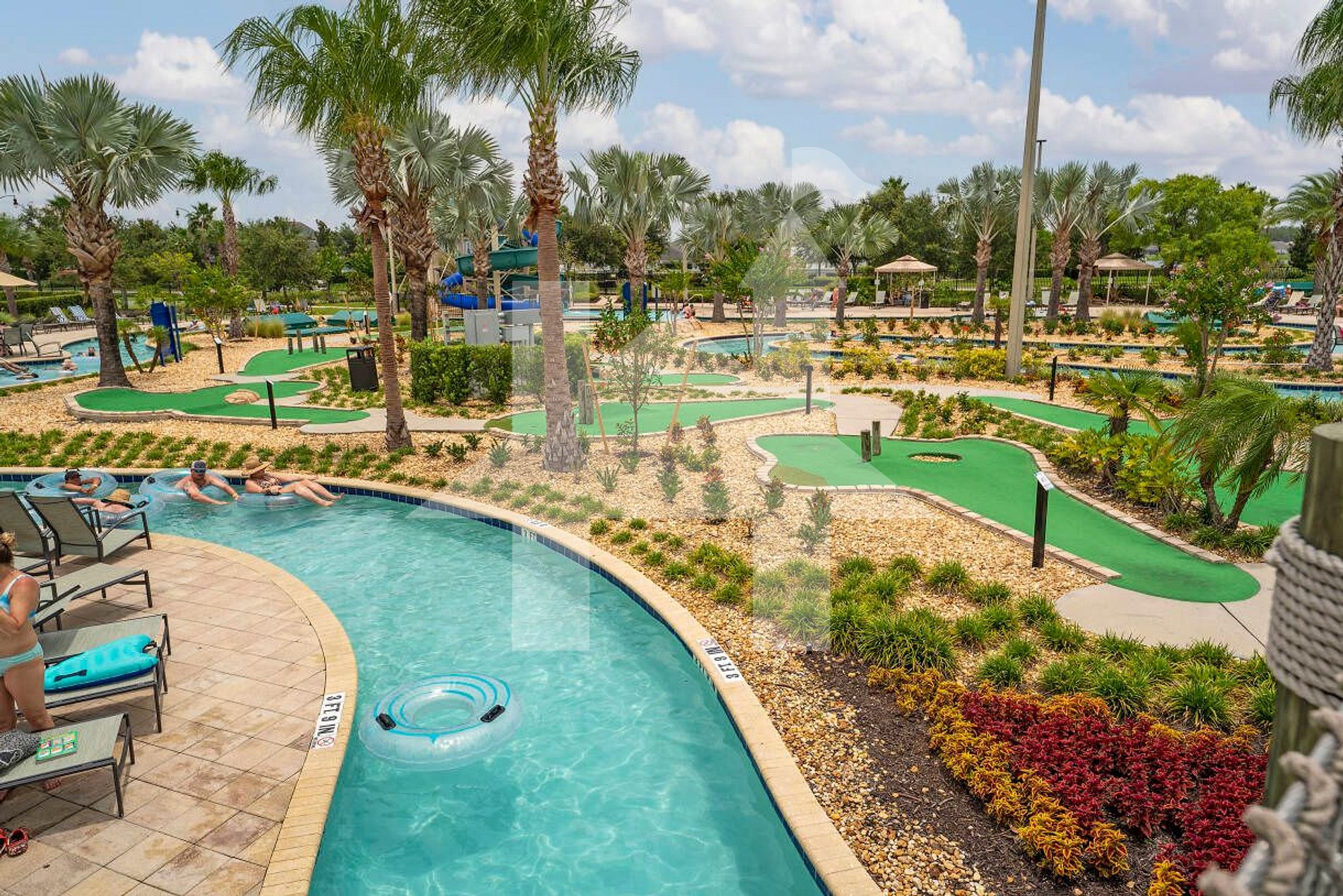 Piscinas estilo resort com escorregadores e área infantil