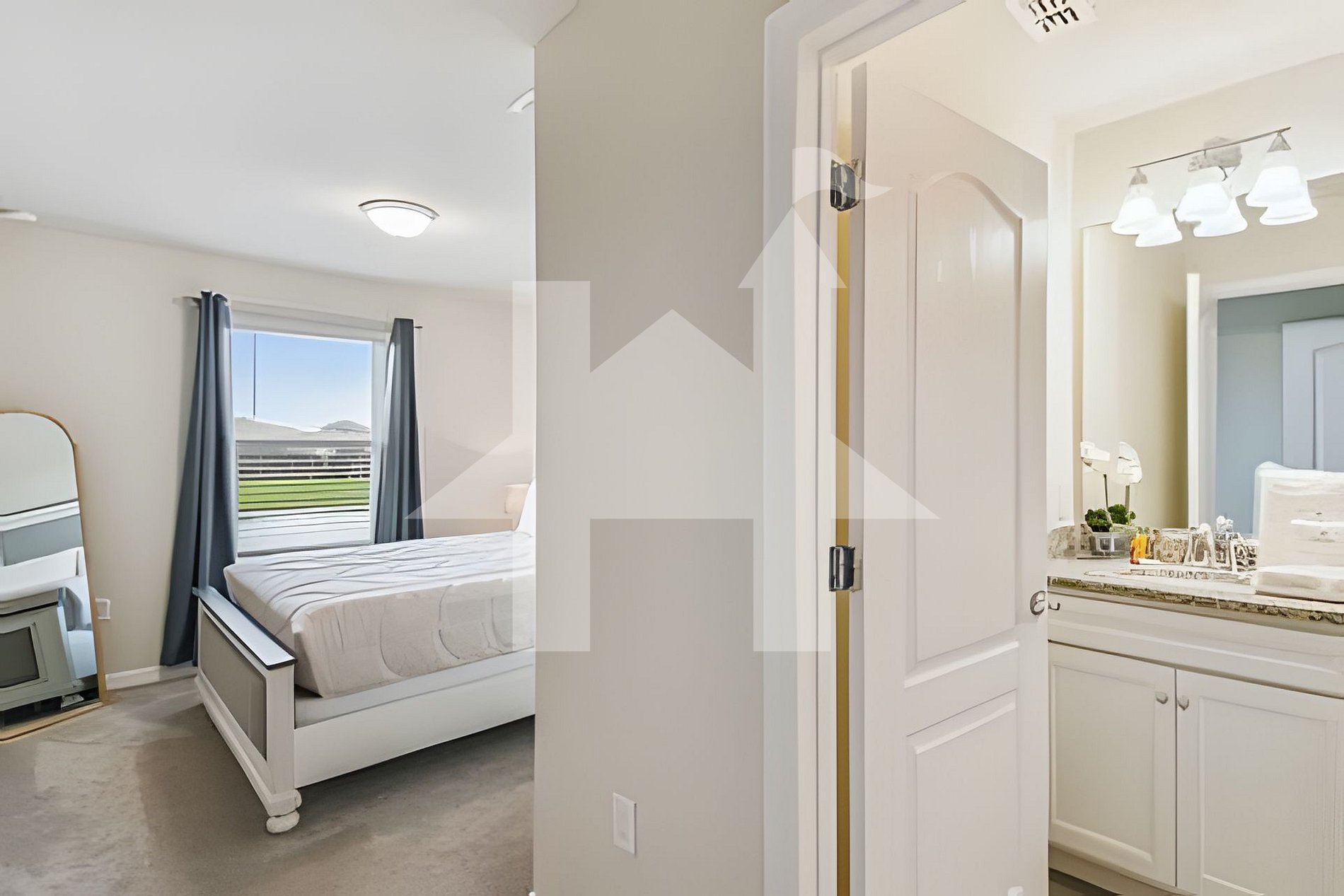-Quarto com cama Queen e banheiro compartilhado. -Lavabo próximo à área da piscina.