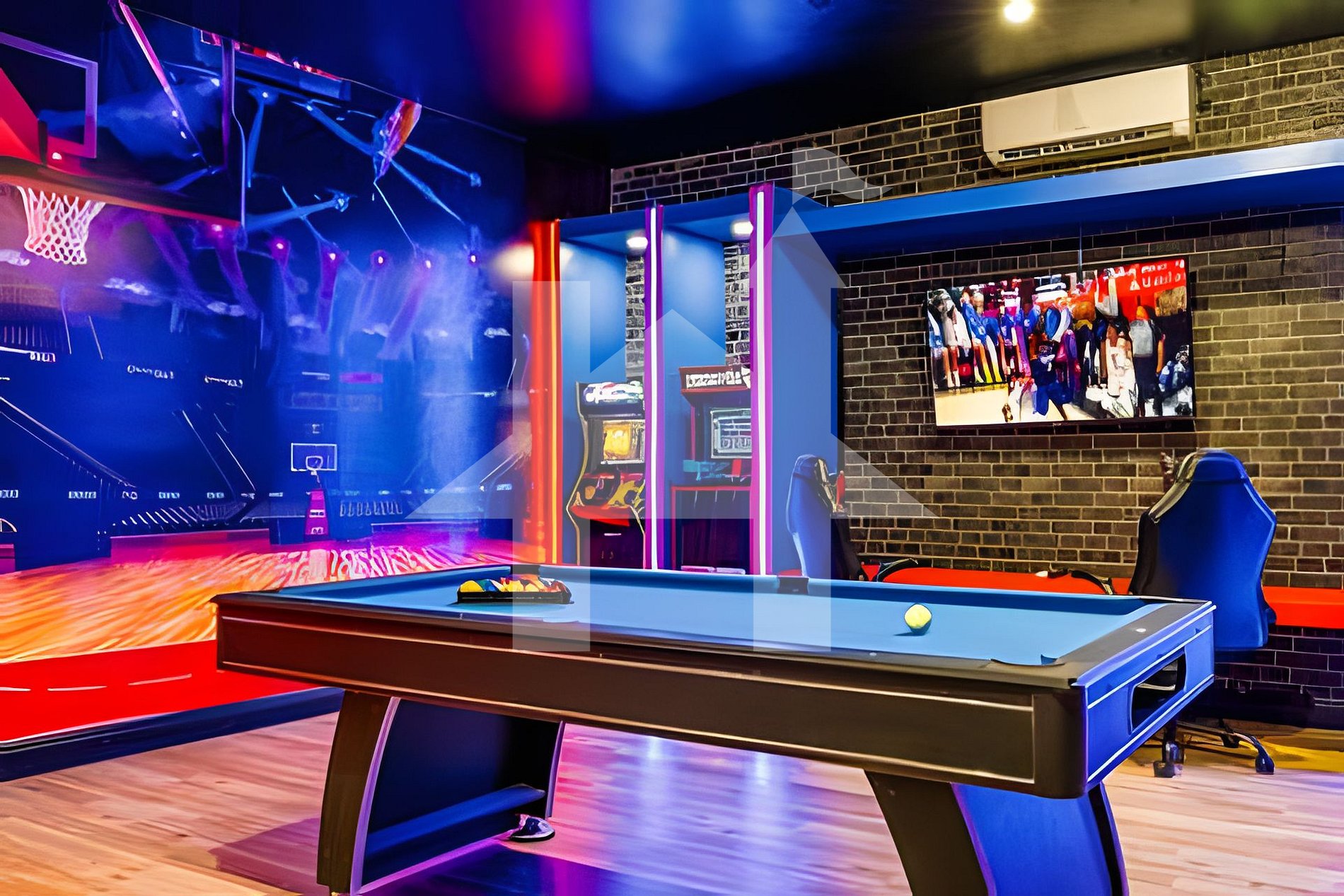 ☆ Luxurious 4-bedroom, 4-bathroom single-level home at Windsor Hills Resort, just 3 miles from Disney. ☆ Dive into fun in the private pool or enjoy endless entertainment in the air-conditioned game room featuring arcades like The Fast & The Furious, Mortal Kombat, and more. ☆ Spacious living area with a 75-inch Smart TV, fully equipped kitchen with brand-new appliances, and al fresco dining under the covered lanai. ☆ Perfect for families with themed kids’ rooms!