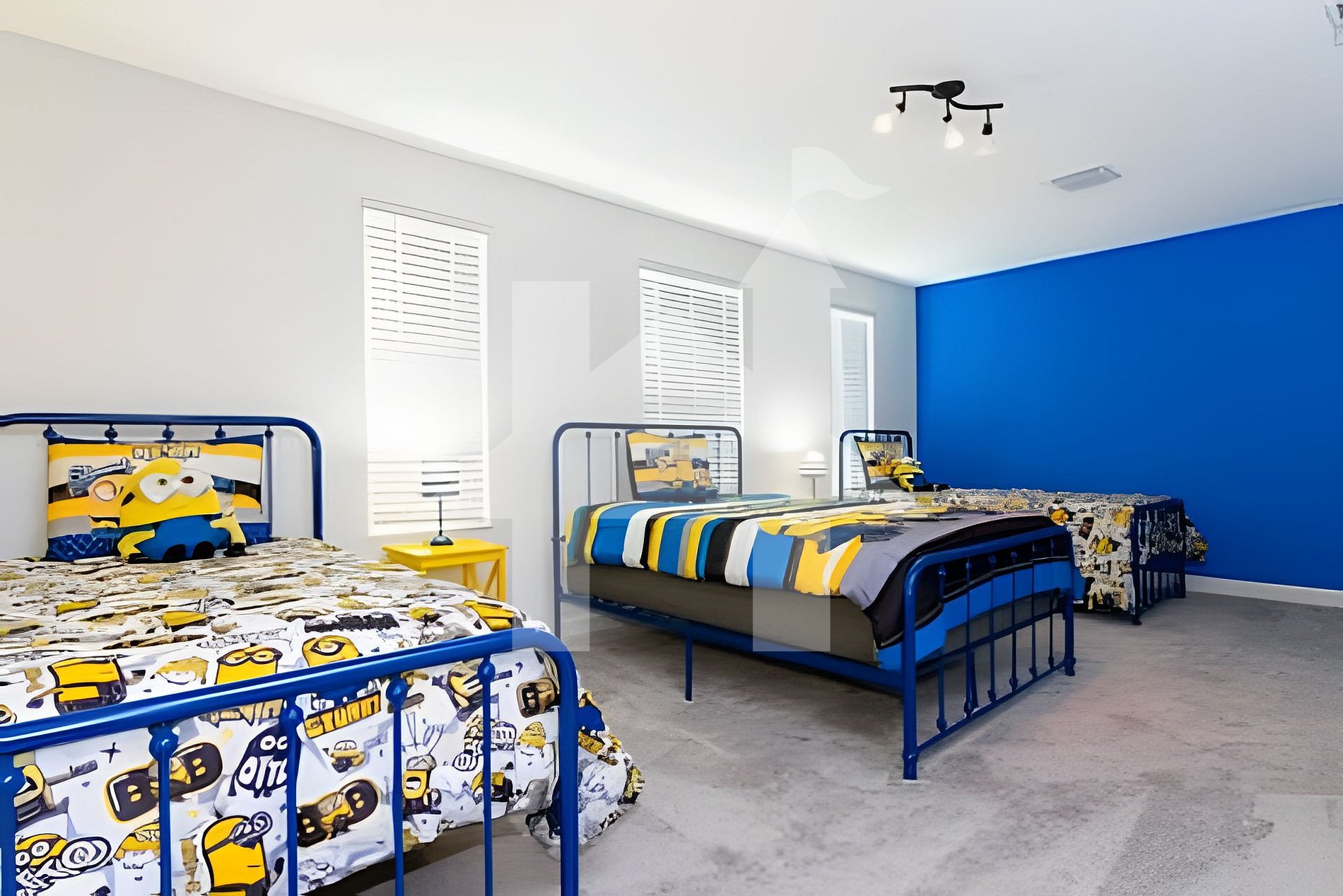 Bem-vindo a uma casa HoliStays, onde cada estadia é tranquila e memorável. Gerenciada por nossa equipe local especializada em casas de temporada na região da Disney, garantimos limpeza impecável, suporte 24h em vários idiomas, concierge sem custo adicional e todo o conforto de uma experiência estilo resort do check-in ao check-out. Conforto, espaço e diversão para grupos grandes a poucos minutos da Disney! Esta incrível casa de 9 quartos e 5 banheiros no Champions Gate Resort acomoda até 22 pessoas com muito estilo e comodidade. Com piscina privativa aquecida, quarto temático dos Minions, sala de jogos e espaços amplos, é o lugar ideal para férias em família ou entre amigos. Térreo Quarto 1: Cama king, suíte com banheiro Quarto 2: Cama queen, suíte com banheiro Cozinha completa, sala de jantar e estar integradas Acesso à piscina e pátio Segundo Andar Quarto 3: Cama de casal + sofá-cama Quarto 4: Cama queen Quarto 5: 2 camas de solteiro Quarto 6: Cama de casal + cama de solteiro Quarto 7: Cama queen Quarto 8: Cama queen Quarto 9 (tema Minions): 2 camas de casal + 2 de solteiro Game room e sala de estar adicional 3 banheiros completos