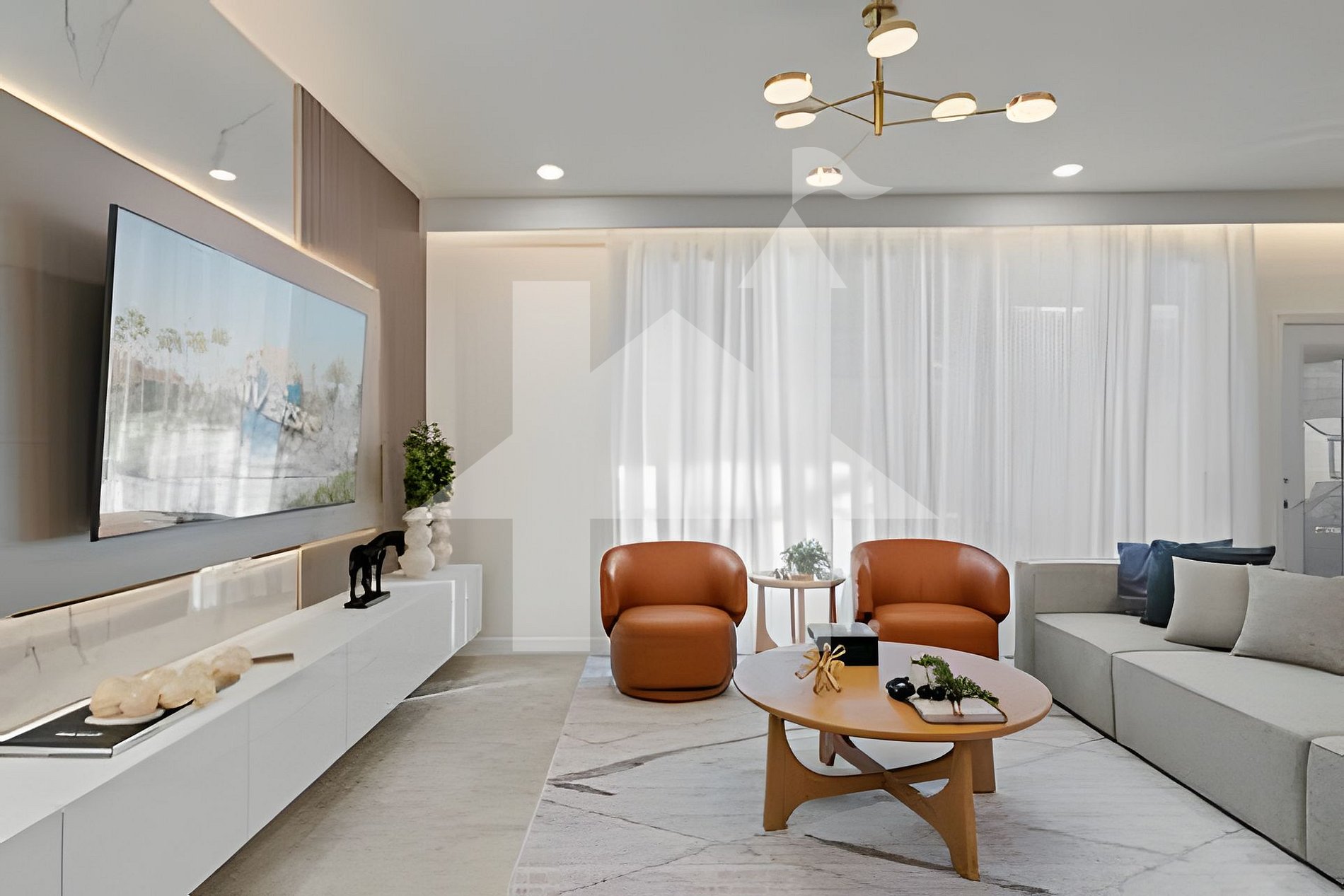 - Sala de estar integrada com decoração elegante e Smart TV de 75”
