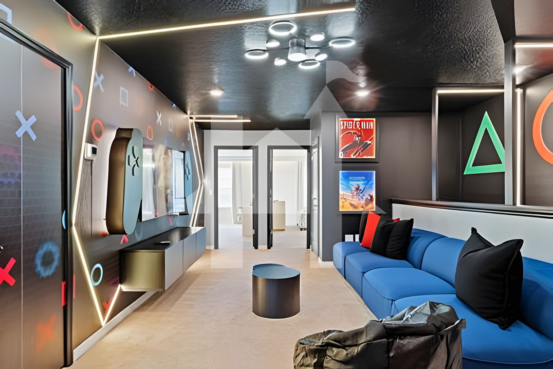 - Loft temático PlayStation com TV 65”, sofá e espaço de convivência