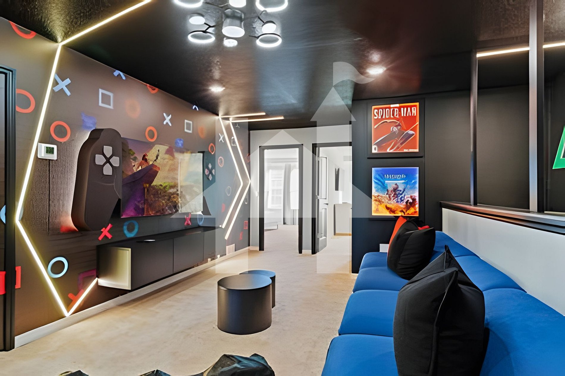 - Loft temático PlayStation com TV 65”, sofá e espaço de convivência