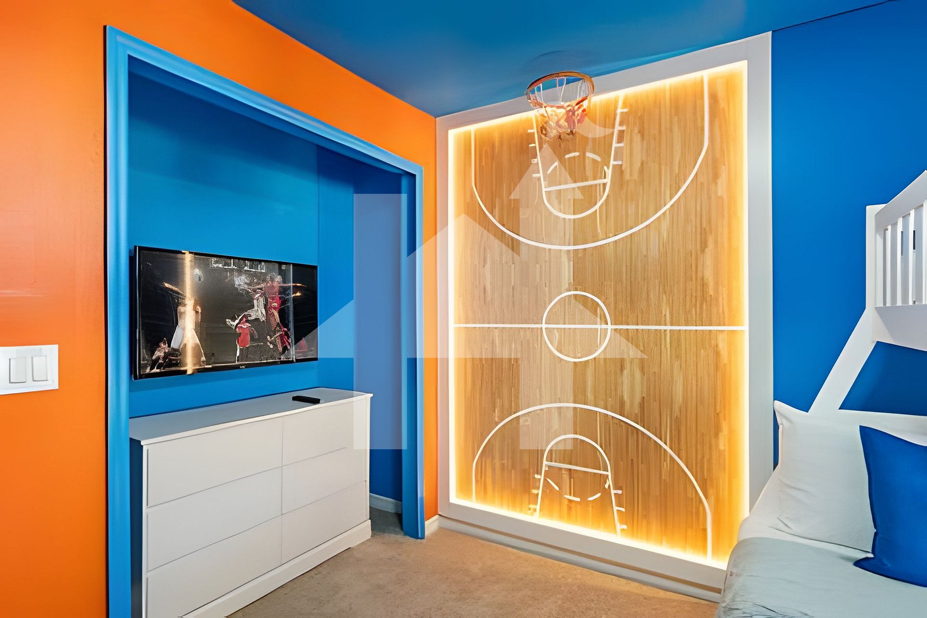 - Quarto NBA: beliche (solteiro sobre casal) + cama extra, decoração esportiva