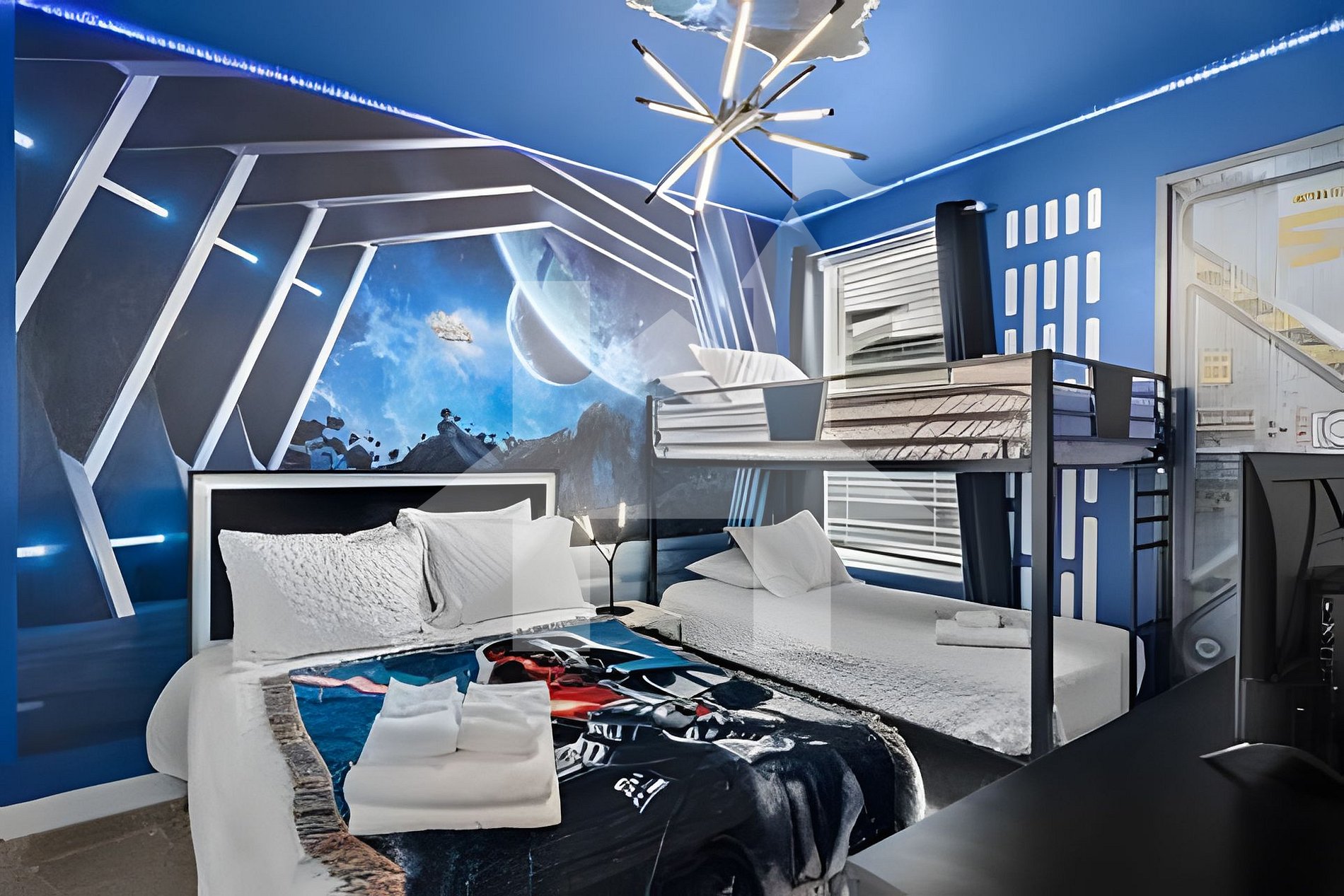 Bem-vindo a uma casa HoliStays, onde cada estadia é perfeita. Gerenciada por nossa equipe local especializada em casas de férias na região da Disney, garantimos limpeza impecável, suporte 24h em vários idiomas, concierge gratuito e conforto estilo resort do check-in ao check-out. Mergulhe em um mundo mágico nesta casa temática com 6 quartos e 5 banheiros, localizada no prestigiado Champions Gate Resort. Acomoda até 18 hóspedes com muito conforto, estilo e acesso às comodidades do resort a apenas 20 minutos da Disney! Cada ambiente é inspirado em histórias encantadoras e amadas por todas as idades, com decoração temática do Rei Leão, Encanto, Star Wars, Mickey e um majestoso Castelo da Disney. A área social conta com sala integrada, cozinha equipada e espaço para refeições em família. Distribuição da Casa & Quartos Temáticos - Quarto 1 (Térreo): Tema Rei Leão | 1 cama King | Banheiro privativo - Quarto 2: Tema Mickey Master | 1 cama King | Banheiro privativo - Quarto 3: Castelo da Disney | 1 cama Queen | Banheiro privativo - Quarto 4: Tema Encanto | 2 beliches (4 camas de solteiro) | Banheiro privativo - Quarto 5: Tema Mickey | 1 cama de casal + 1 beliche (2 solteiros) | Banheiro compartilhado - Quarto 6: Tema Star Wars | 1 cama de casal + 1 beliche (2 solteiros) | Banheiro compartilhado Entretenimento & Extras - Sala estilo cinema para noites de filme - Sala de jogos temática Mario Bros - Piscina privativa aquecida com tela de proteção - Churrasqueira: US$ 100 por semana - Aquecimento da piscina: US$ 40 por dia (mínimo de 3 dias) - Wi-Fi de alta velocidade - Ar-condicionado central - Lavadora e secadora - Estacionamento gratuito (incluindo garagem) - Kit de boas-vindas com itens de higiene e cozinha (reposição por conta do hóspede)