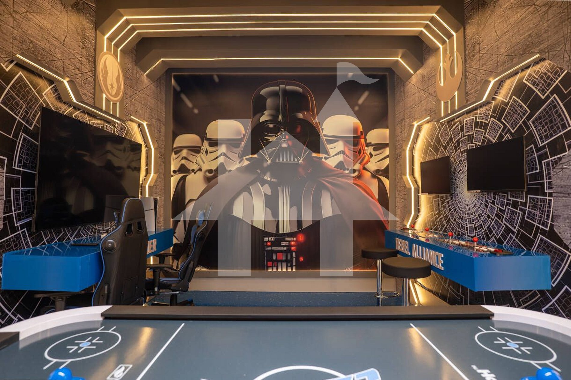Loft de jogos e entretenimento com tela grande