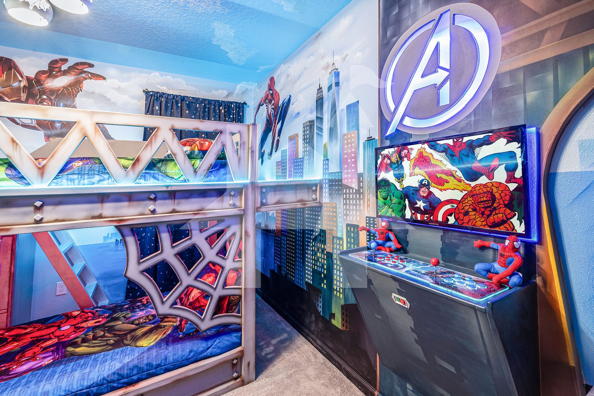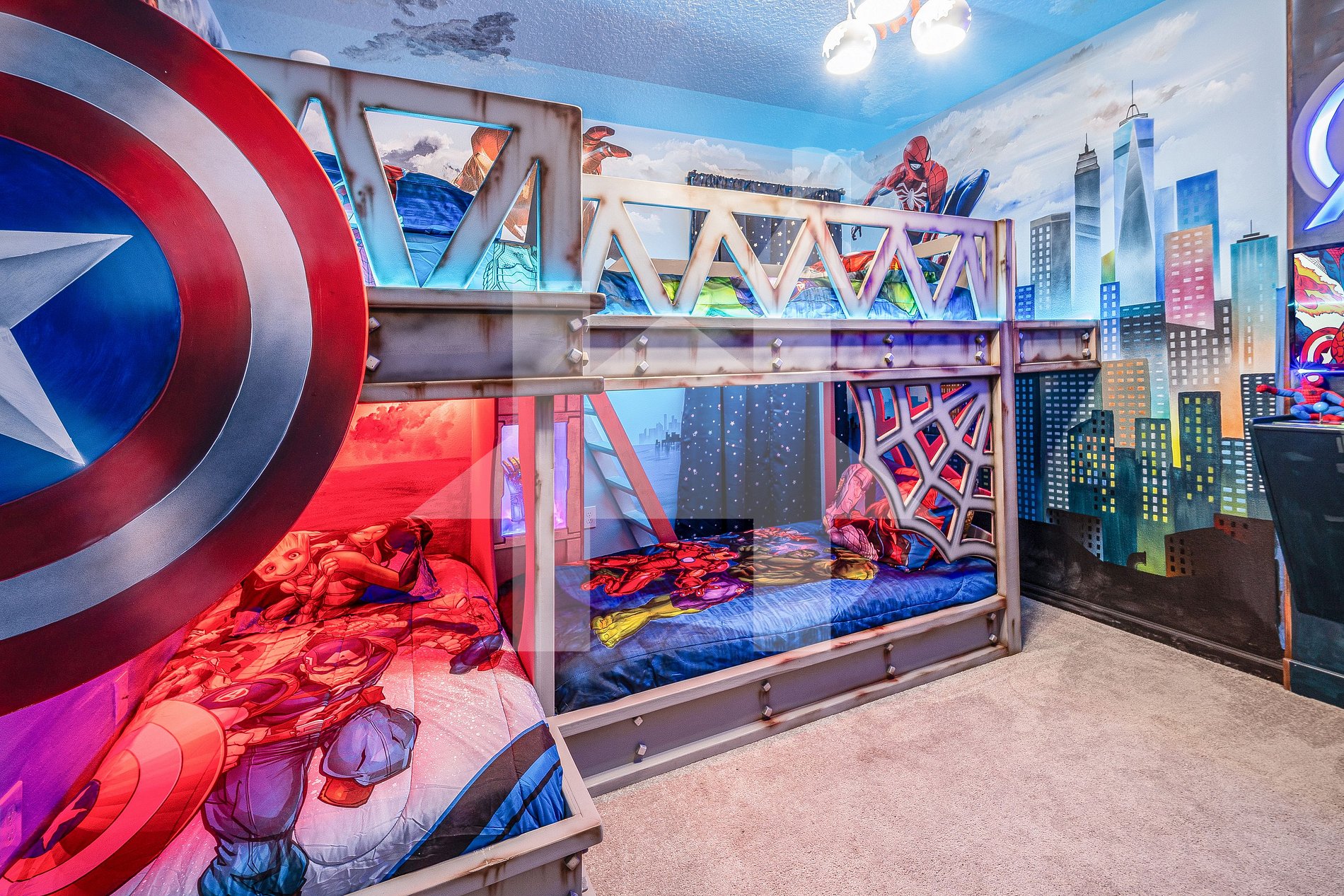 • Quarto Avengers com duas beliches twin-over-twin, banheiro privativo