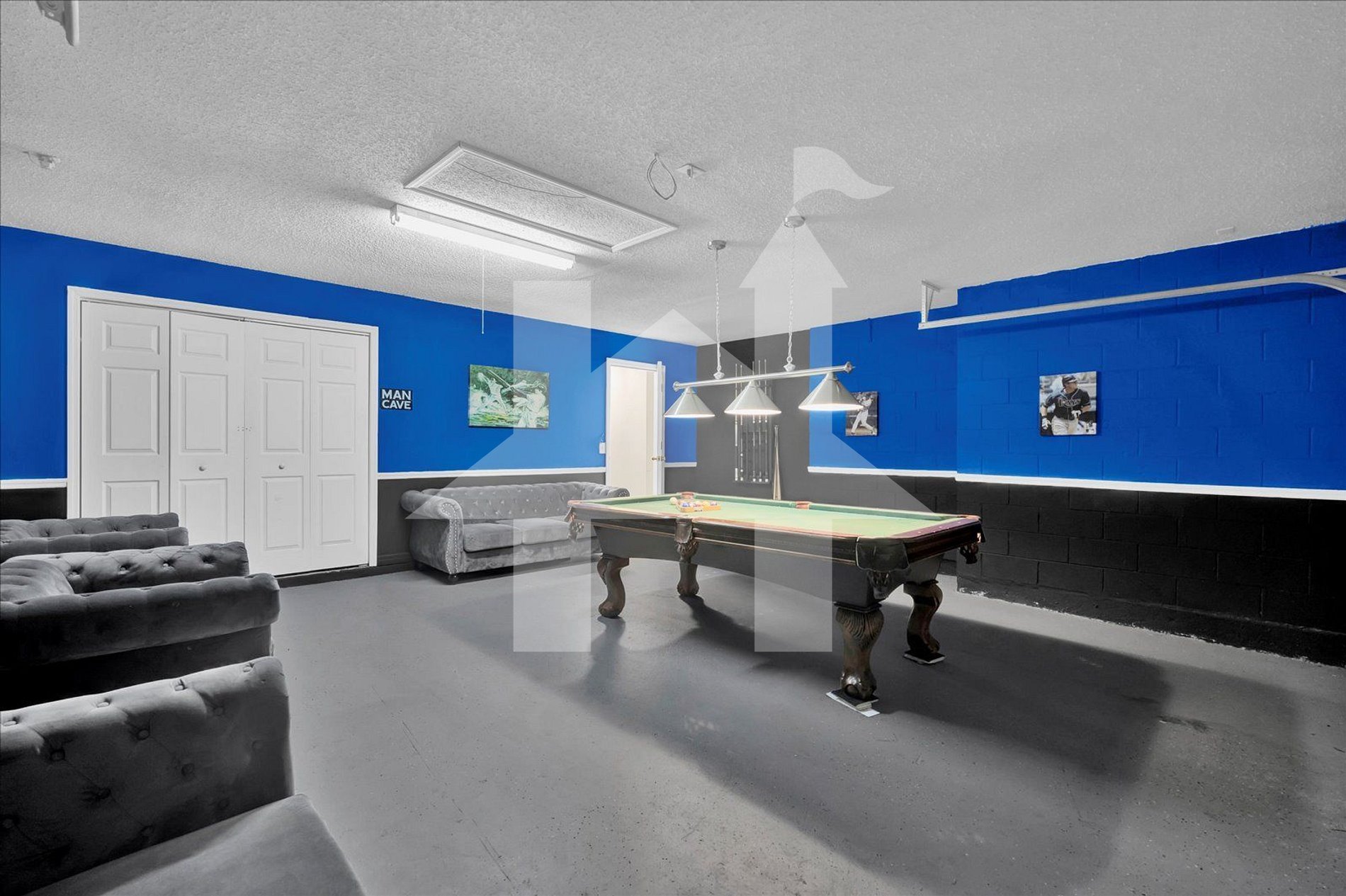 A garagem foi convertida em uma sala de jogos, perfeita para diversão em grupo.