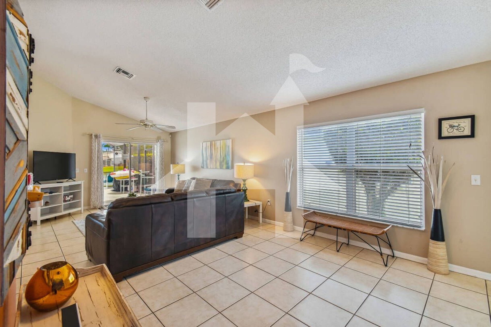 O ambiente integrado conta com sala espaçosa com Smart TV de 45”, sofá confortável e acesso direto à área externa coberta e telada, onde estão as espreguiçadeiras e a piscina — ideal para curtir o sol da Flórida.