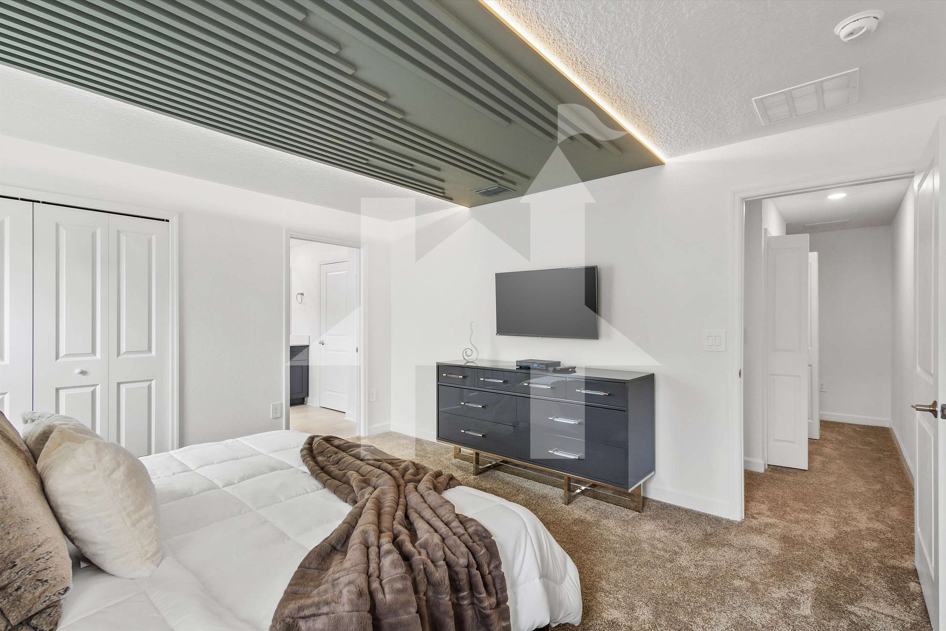 Suíte master com cama king, banheiro privativo e smart TV