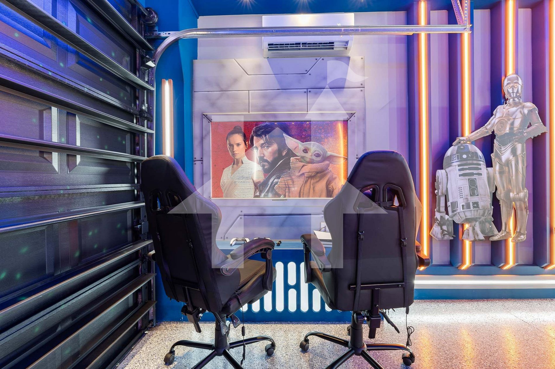 Game room Star Wars com mesa de bilhar, pebolim e jogos arcade